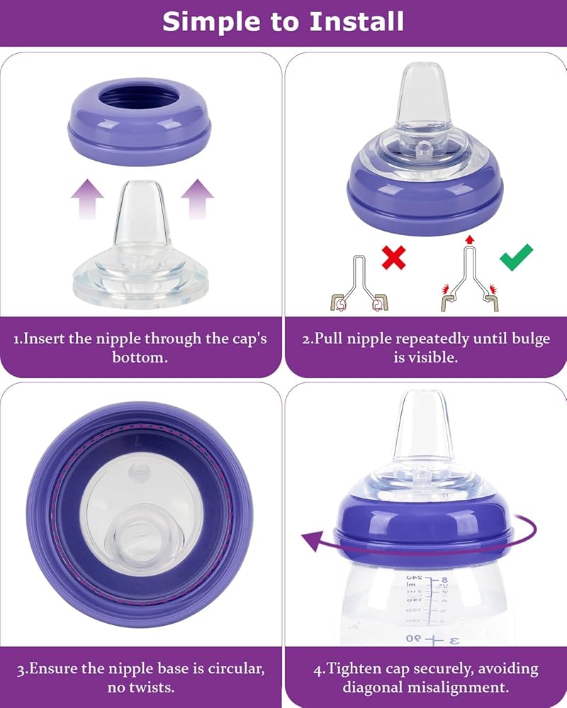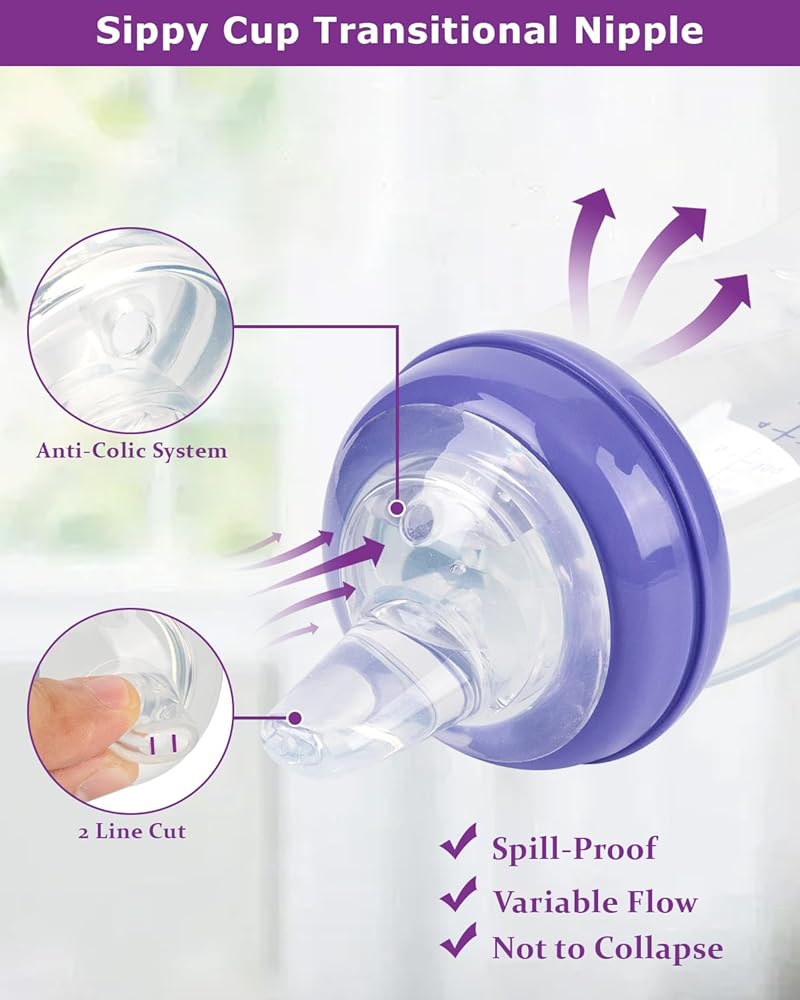 • يتسرب التسرب ويمنع الاختناق: يتميز صنبور الحلمة الانتقالية الكأس SIPPY بفتحات مزدوجة على شكل حرف V وفتحتين لقطات خطين ، مما يمنع التسريبات مع ضمان سائل طفلك ، وليس الهواء. يقوم Sippy Spout Nipple بضبط التدفق تلقائيًا بناءً على قوة مص طفلك لتجربة مخصصة