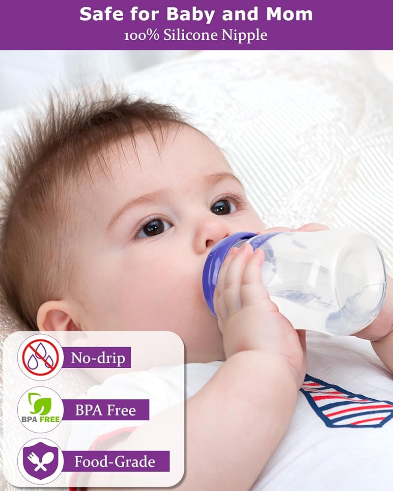 • 100 ٪ Baby Safe: حلمة زجاجة الطفل مصنوعة من السيليكون من فئة الطعام ، خالية من BPA ، الفثالات ، و PVC. ناعم ولطيف ، يوفر تجربة مص مريحة مع حماية لثة طفلك ، وضمان الاستخدام الآمن على المدى الطويل