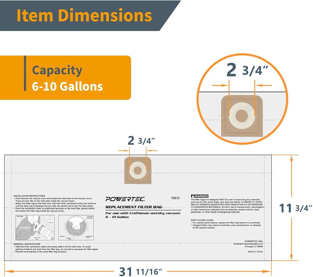 These high efficiency wet/dry vacuum bags keep your Craftsman 6 - 10 gallon wet/dry vac running at peak performance with these high-quality replacement filter bags. The bags are designed to collect dry materials and ultra-fine debris, such as drywall dust, sanding particles, sawdust, dirt, cold ashes and other non-hazardous materials.