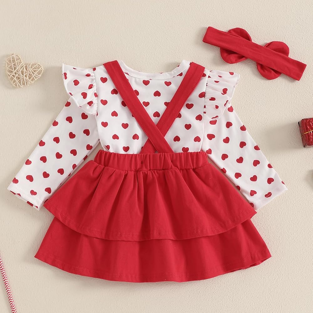 Newborn Baby Girl Valentine's Day Outfit Long Sleeve Romper Bear Embroidery Tulle Suspender Skirt Headband Set