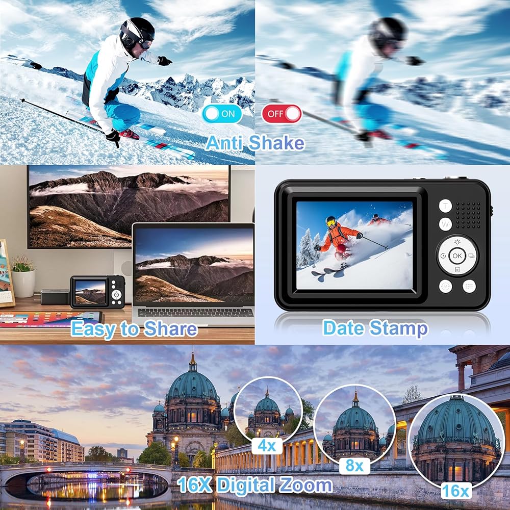 تكبير قوي لممارسة التصوير الفوتوغرافي: مجهز بوظيفة تكبير 16x ، تتيح هذه الكاميرا الرقمية للأطفال التعمق في ممارسة التصوير الفوتوغرافي. يمكنهم استكشاف مختلف الموضوعات والتقاط تفاصيل معقدة. اختيار لطيف لكاميرا رقمية صغيرة ولكنها قادرة على الأطفال والمراهقين.
