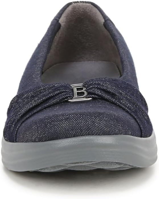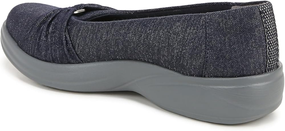 Ease into slip-ins that bring comfort to the everyday! Wear, wash, love. Stretch sparkle fabric upper with partially recycled lining and round toe. Slip-ins for easy on/off. Bzees metallic ornamentation. BLOOM™ materials: Eco-conscious algae-infused foam layer under the insole. BZEES Cloud Technology: Designed so you'll feel weightless, energized and free. Ultra Lightweight: Step lightly with a nearly weightless feel. Dynamic Stretch Fabrics: Move freely in shoes with built-in stretch. FreeFoam™ Comfort: Low pressure insoles with maximum foot contact and cushy arch support. DreamPuff foam padding at the heel. SoCush arch support. . 1 3/8 inch heel. EVA outsole. Get Width It: Countless pairs of Bzees come in wide width shoes for women. Machine Washable: Wash on cold and air dry.