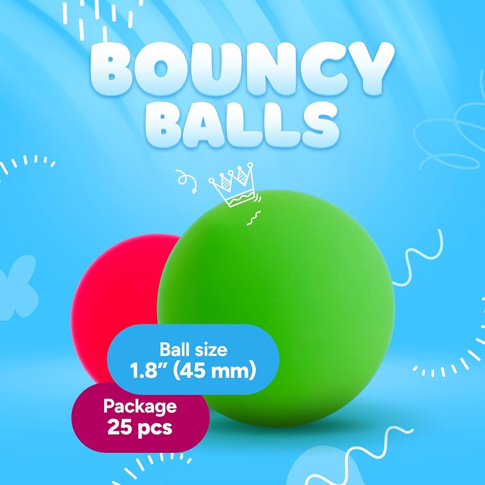 Bouncy balls for kids come in 45mm - 1.77 inch size. Bucket includes random amount of 4 different colors in frosty style – a great choice as party favors bouncy balls kids