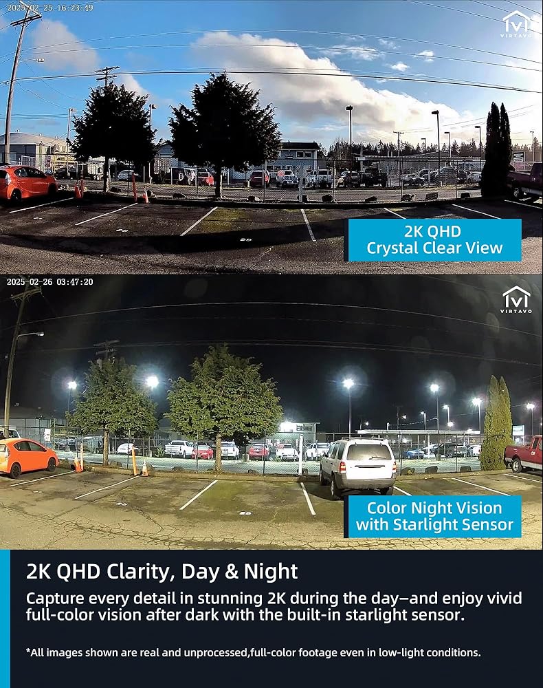 Virtavo Solarflask 2K Solar Security Cameras Wireless Outdoor ، عدسة ضوء النجوم ، الرؤية الليلية الملونة ، الكشف عن حركة PIR ، الصوت الذي يعمل بالبطاريات ، صوتي ثنائي الاتجاه ، مقاوم للطقس ، تخزين سحابة/SD ، WIFI 2.4 جيجا هرتز