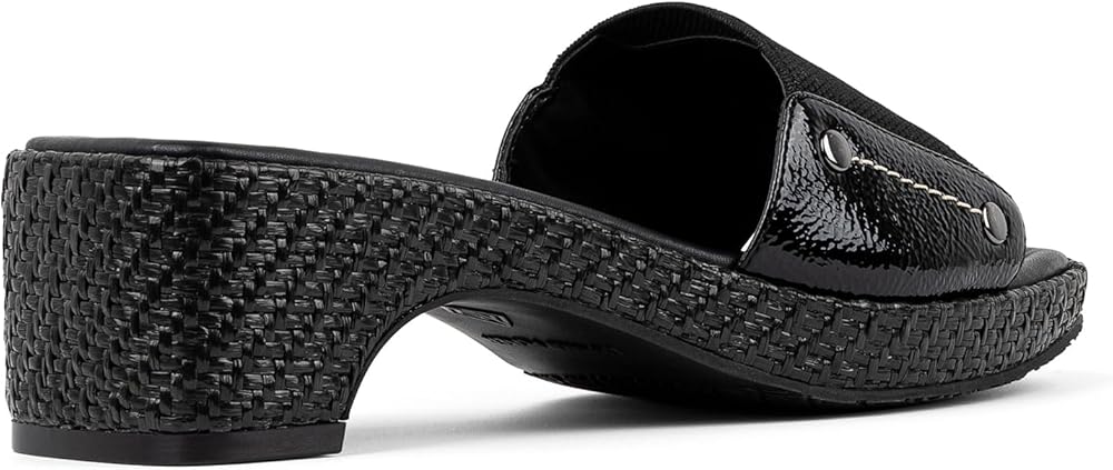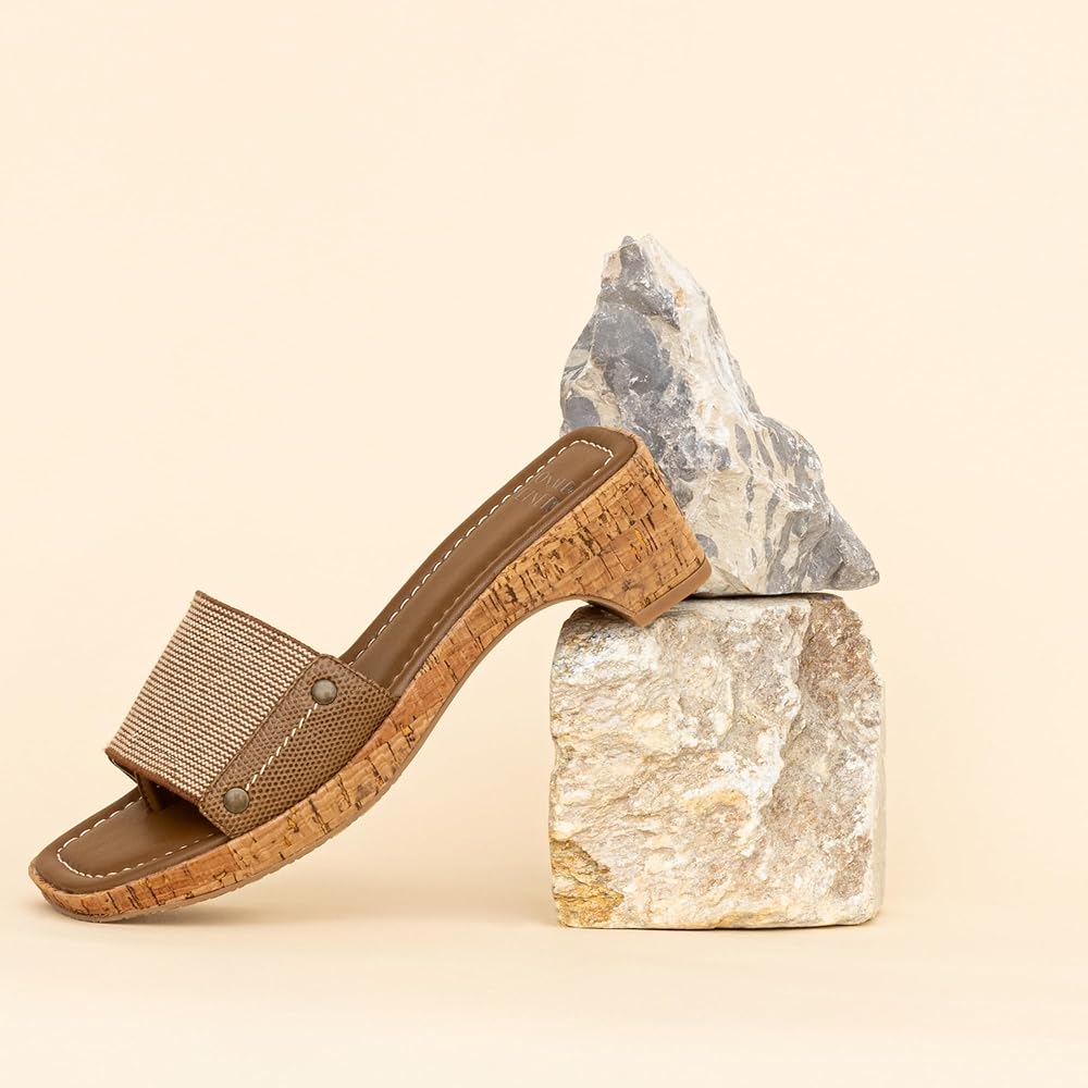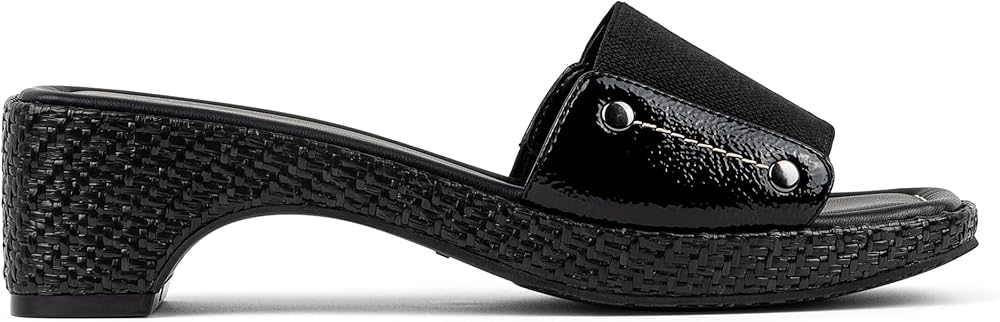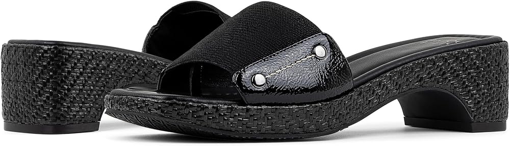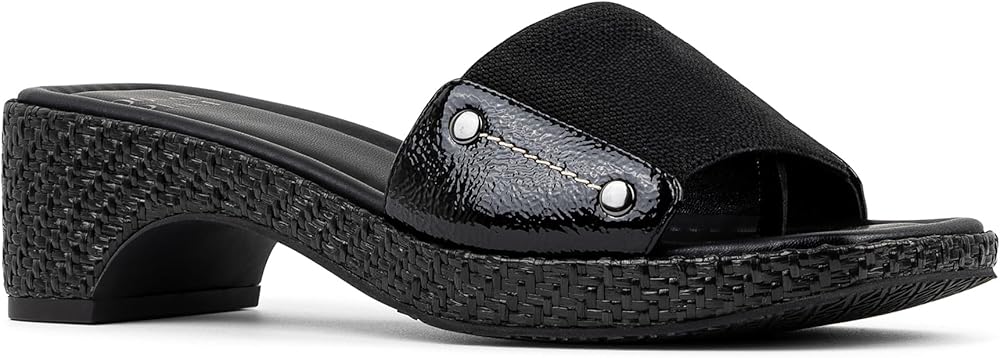 The RODEO wedge sandal features a low platform design with studded detailing for a subtle edge. The elastic upper is enhanced with crinkle patent trim, while the memory foam padded insole provides a cushioned feel. A secure toe post and non-slip rubber outsole ensure stability, making this sandal a go-to for everyday wear.