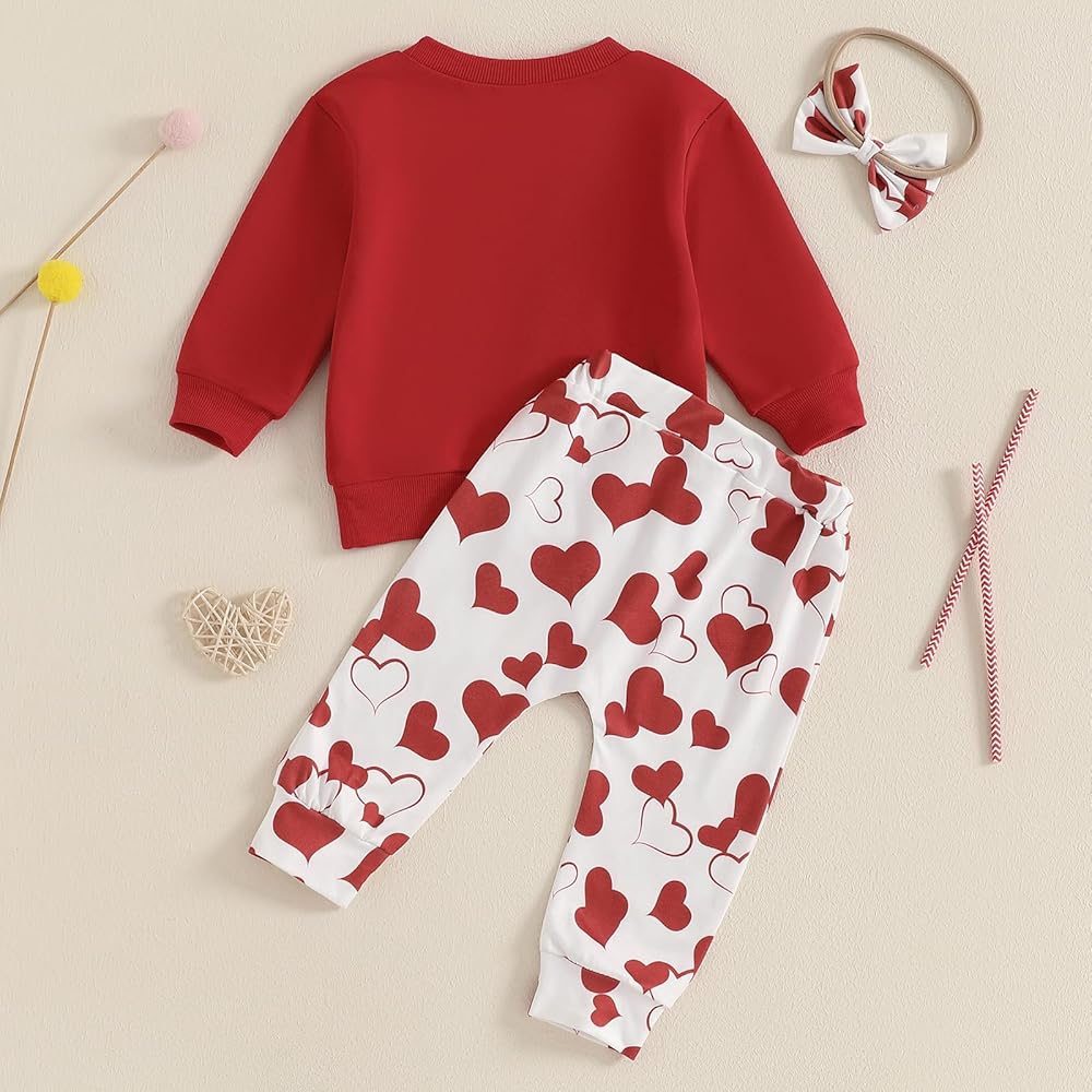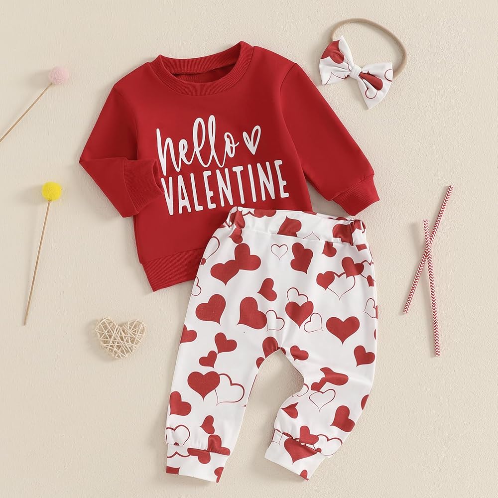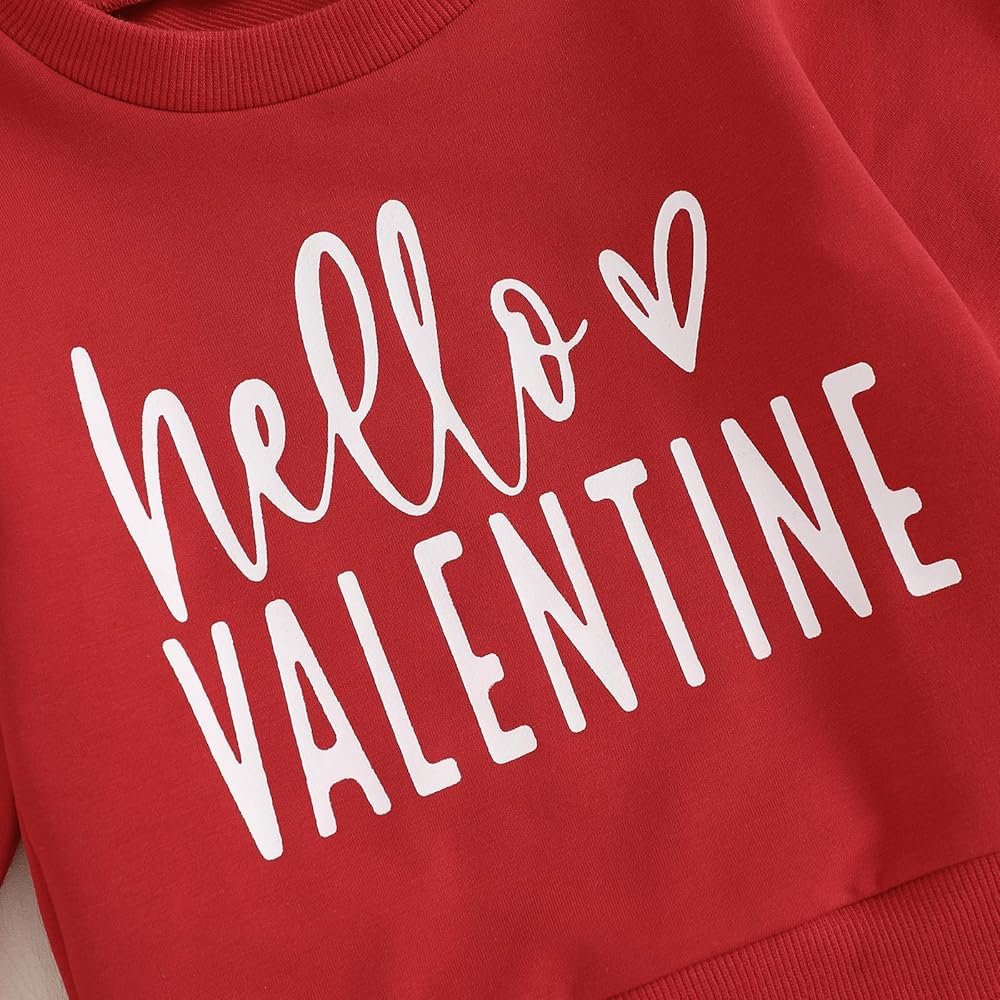 Toddler Baby Girl Valentines Day Outfit Hello Valentine Crewneck Sweatshirt Heart Print Pants Headband Clothes Set