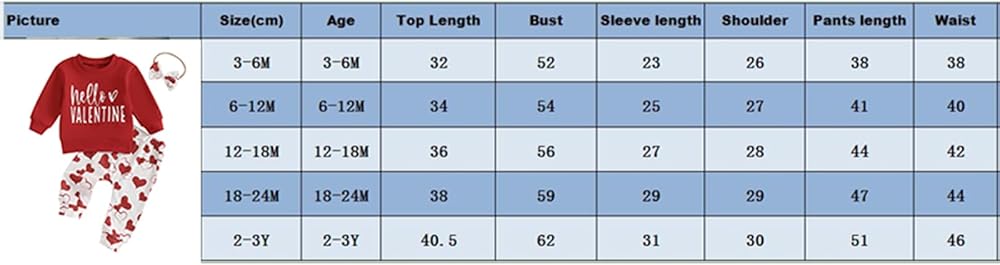 6-12M Tops Length: 13.39 Bust: 21.26 Sleeve: 9.84 Shoulder: 10.63 Pants Length: 16.14 Waist: 15.75 Advised Age: 6-12 Months