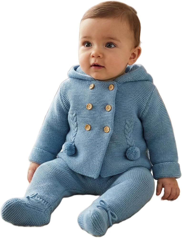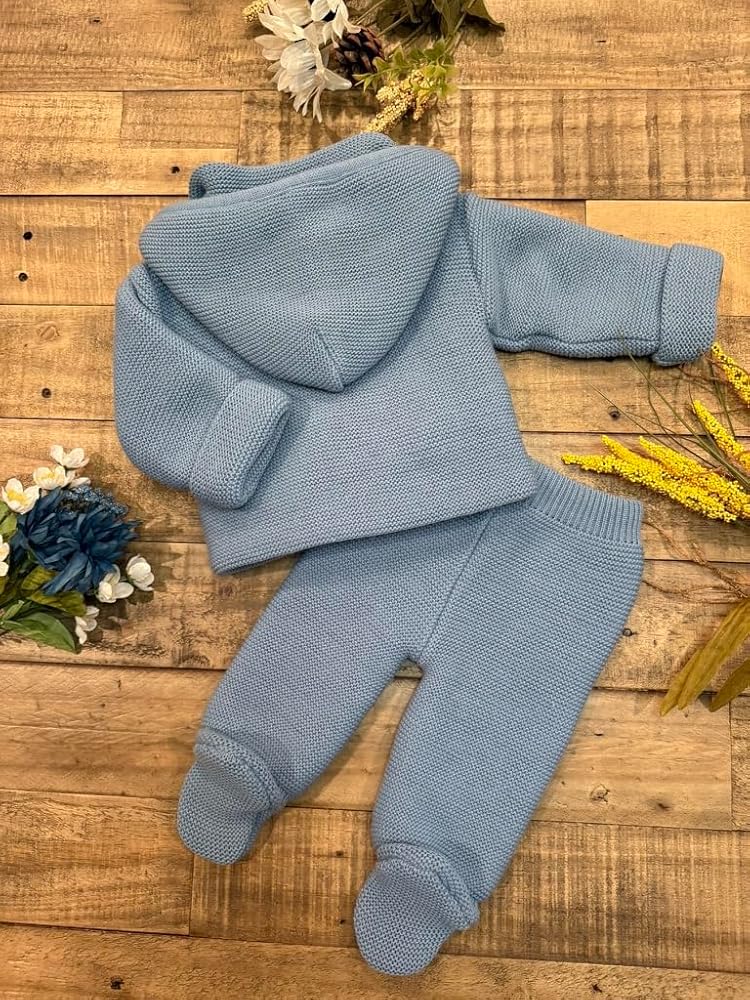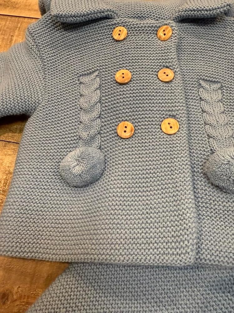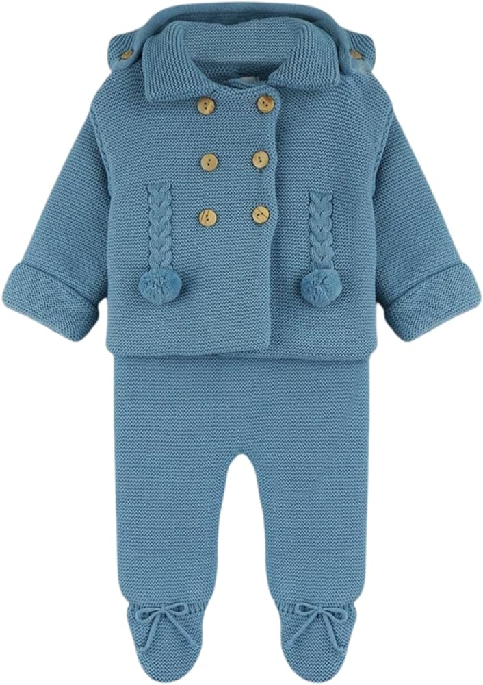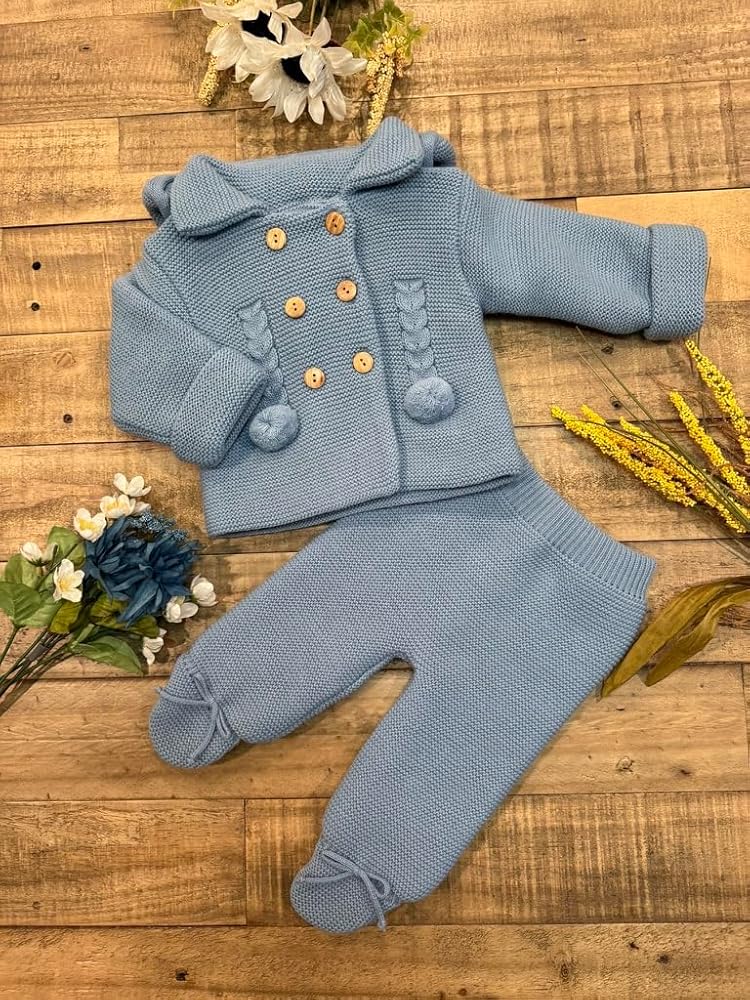 This adorable knitted outfit is perfect for keeping your little one cozy and stylish. The soft, breathable fabric in a lovely hue envelops them in warmth and comfort. The jacket features delicate braided details and charming pom-pom accents, while the matching pants have cute tie closures at the ankles. This two-piece set is a delightful choice for playdates, family gatherings, or simply lounging at home. With its timeless design and quality craftsmanship, this ensemble is sure to become a cherished favorite.
