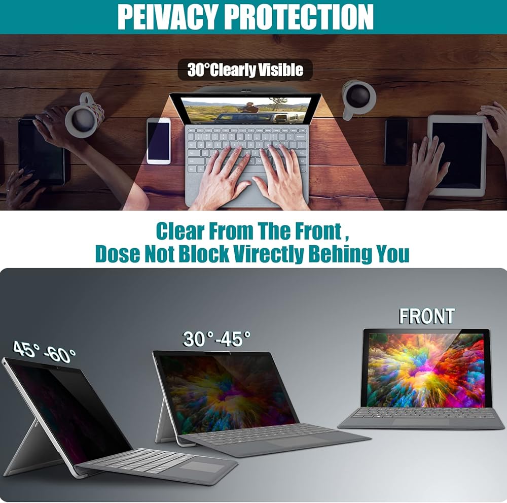 【Superior Privacy Protection】The computer privacy screen filter is perfect for office, public and high traffic areas. It limits viewing angle to +/- 30 degrees, data is visible only to persons directly in front of the monitor, while prying eyes beside you see only NOTHING. Perfect combination with Surface pro x privacy screen Protector.