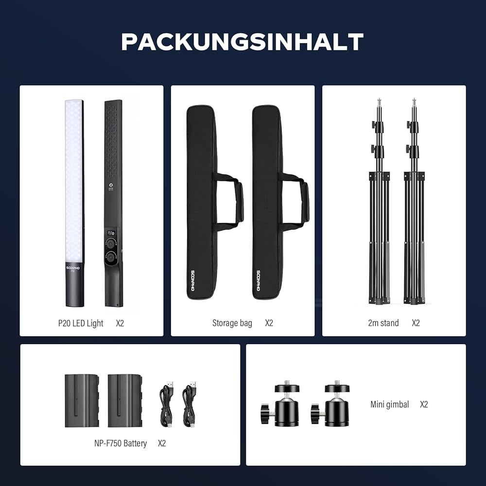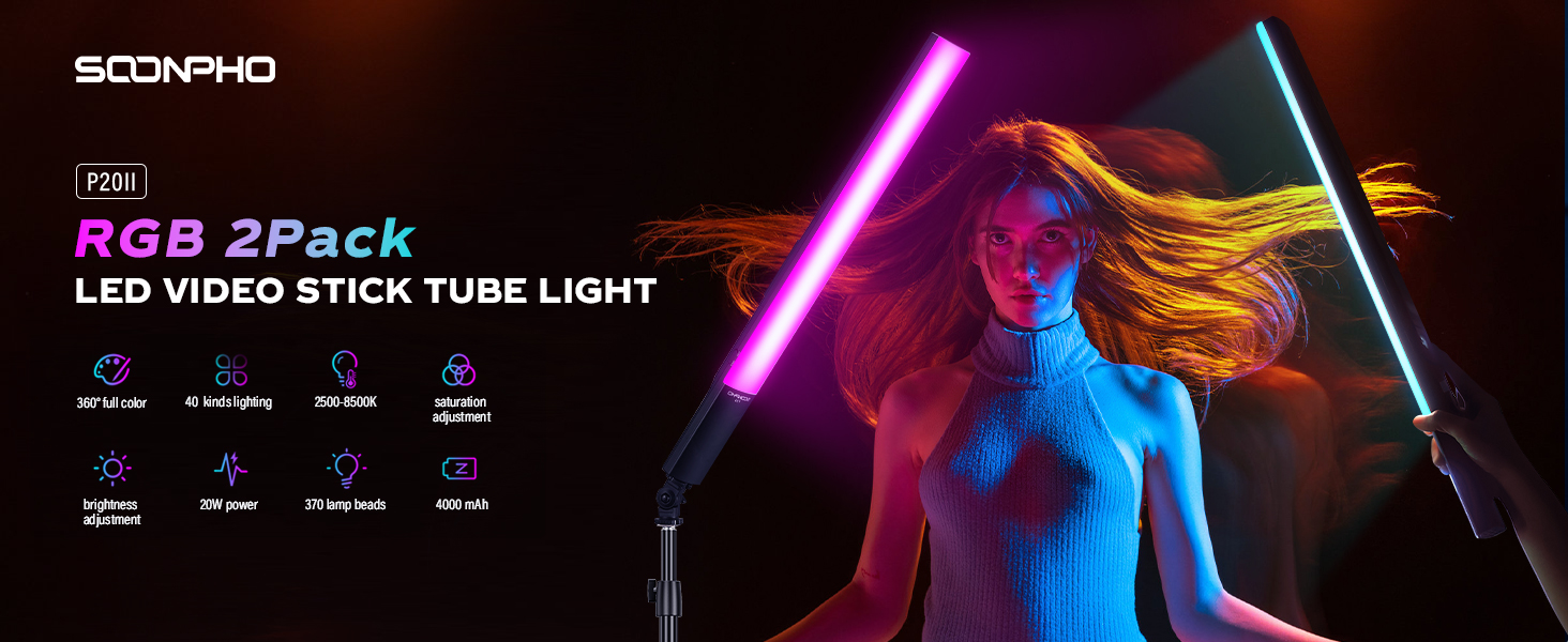 حزمة بما في ذلك: Soonpho p20 Light Stick*2 ،، USB Cable*2 ، Carry Bag*2 ، يقف*2