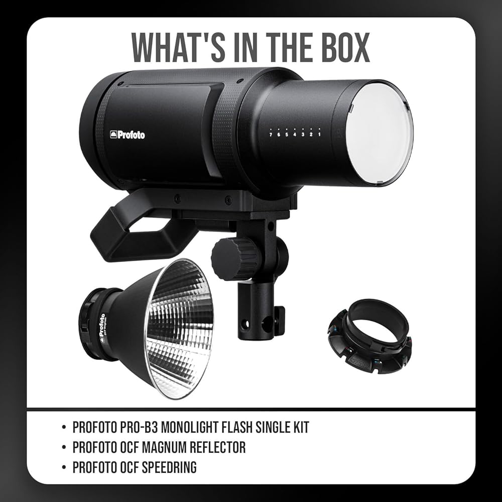 • Included in the Pro-B3 Single Kit: 1x Profoto Pro-B3 1x Battery, 1x Charger, 1x Protection cap, and 1x Pro Monolight case