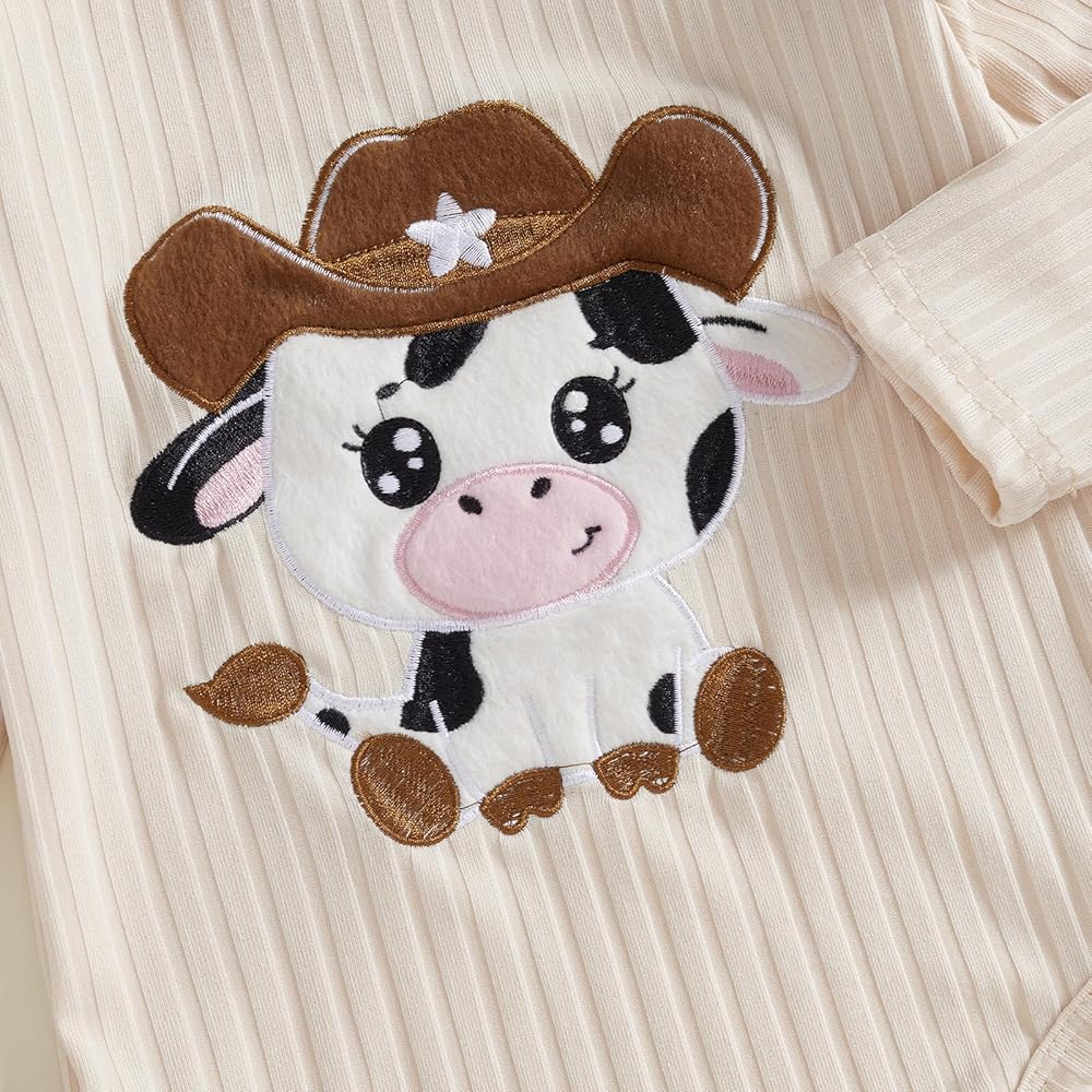 Baby Girls Western Outfit Cow Embroidery Long Sleeves Romper and Cute Bow Pants Headband Set Cute Clothes