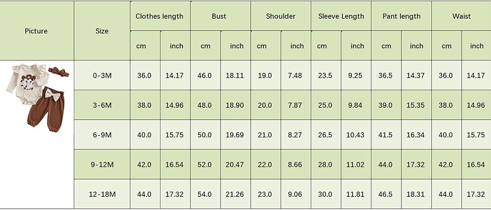 0-3M Romper Length: 14.17 Bust: 18.11 Sleeve: 9.25 Shoulder: 7.48 Pants Length: 14.37 Waist: 14.17 Advised Age: 0-3 Months