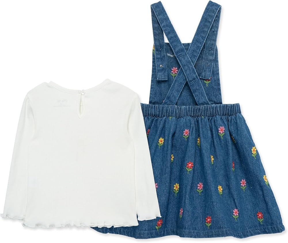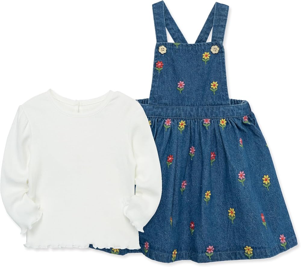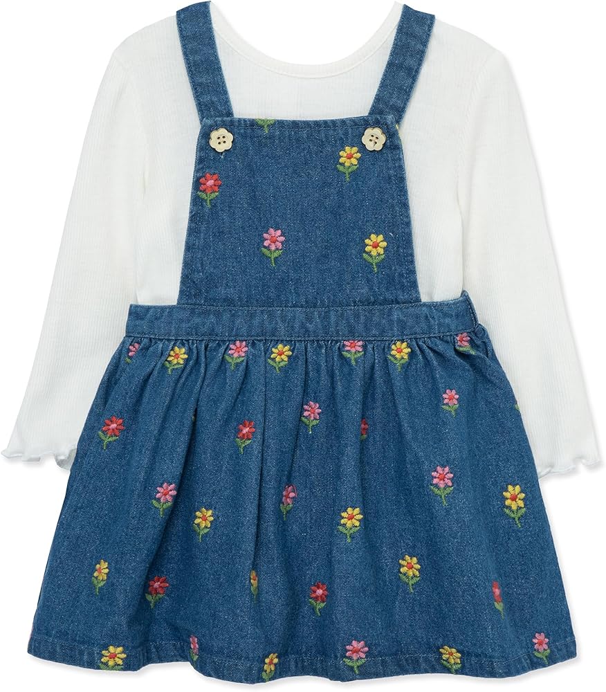 Tiny flowers cover this girls' denim jumper that layers perfectly over the ribbed tee.