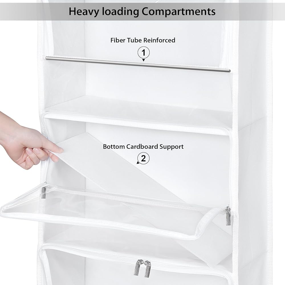 تصميم فريد مقاوم للغبار. يضم ستة جيوب فردية من السوستة ، يحمي منظم المعلق الباب عناصرك من الغبار والرطوبة. يمكنك وضع العناصر الثمينة في الداخل بثقة. بالإضافة إلى ذلك ، يساعدك التصميم الواضح تمامًا على تحديد موقع العناصر التي تحتاجها في لمحة دون فتح كل جيب.