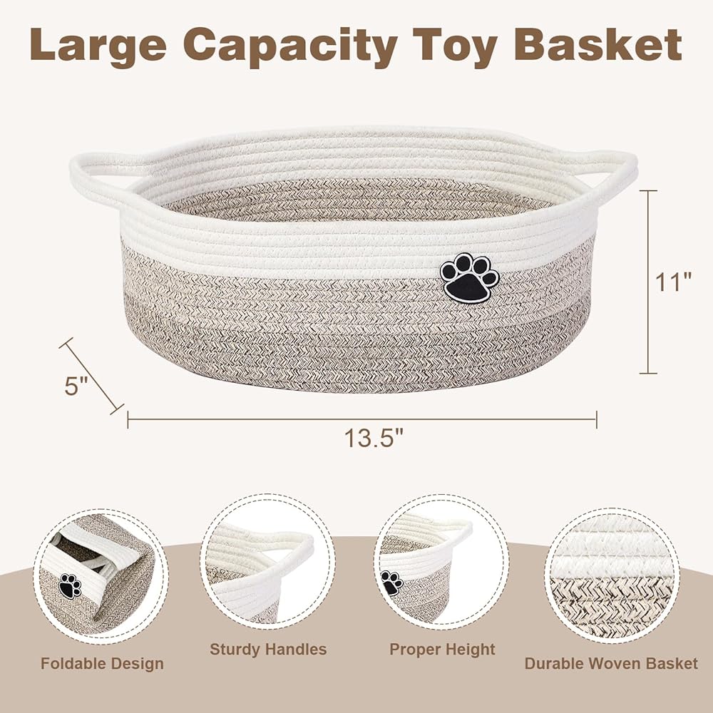 The dog toy box measures 13.5 x 11 x 5 inches, the height of the toy box allows them to see all the toys and easily take toys out. Made of soft cotton rope material, the raised fence design promotes ultimate comfort and security, offering your pet a variety of cozy positions to snuggle. Whether you choose to hand wash or machine wash with a mild detergent, this basket is easy to clean and can be reused for a long time. This storage box can not only hold many of the pet's supplies, but also store baby clothes, diapers, towels, toiletries, and more.