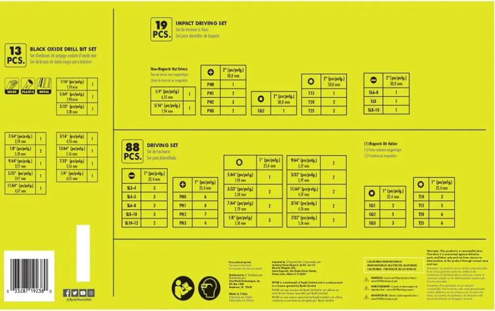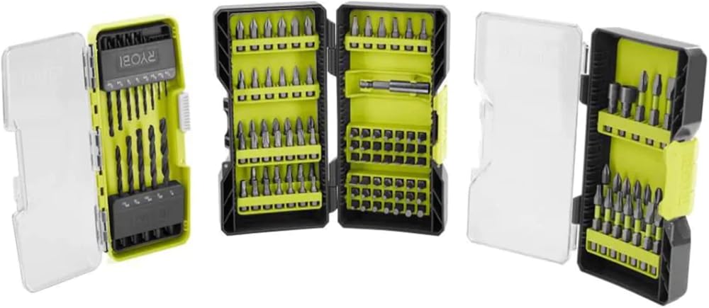 Ryobi 120-Piece Drill and Impact Rated Drive Kit with 3X the life. Includes: Black Oxide, Impact Driving, and Driving Bit Sets. Three cases to conveniently store bits.