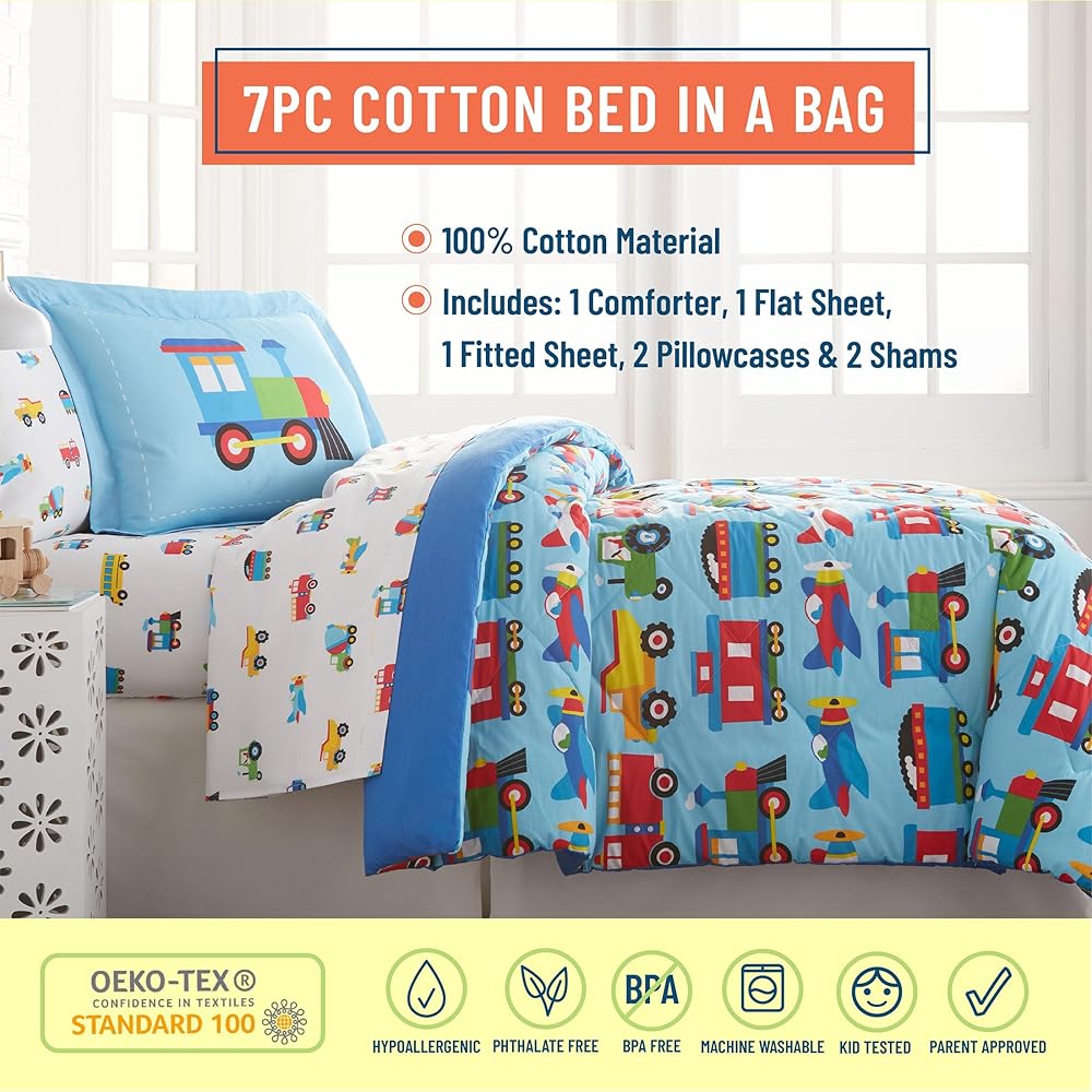 Drifting off to slumber land is a breeze when your child is snuggled up in Wildkin's ultra-cozy 100% Cotton Full Bedding Set! Each full bedding set comes complete with a printed comforter, flat sheet, fitted bottom sheet, two coordinating pillowcases, and two embroidered shams. The comforter, flat sheet, and fitted sheet all fit a standard full mattress. The matching pillowcases and embroidered shams all fit a standard pillow. – Wildkin's 7 Piece Full Comforter features a 100% cotton exterior that's perfect for cozy cuddles. Its lightweight material makes the comforter breathable enough for hot summer nights, while keeping your little one nice and warm once those colder months roll around. Featuring vibrant, playful Olive Kids designs on each of the seven included pieces, your little one will love this fun addition to their room. While the exterior of the comforter is bursting with character, the cotton interior is solid, creating a sweet contrast. The coordinating flat sheet, fitted sheet, pillowcases, and embroidered shams tie the theme together for a bold, whimsical look that your little one will love. Our 100% Cotton Full Bedding Sets are certified OEKO-TEX Standard 100 and free of harmful chemicals, so you can trust that your child's bedding is both extremely safe and comfy. All components of textiles carrying the OEKO-TEX Standard 100 label have been tested for harmful substances and deemed harmless in human ecological terms. Each full bedding set was designed to coordinate with other Wildkin room décor. From plush pillows, to toy chests, to storage cubes, your little one will love seeing their favorite designs pop up throughout their room. Machine wash pieces separately on a cold, gentle cycle. Use only non-chlorine bleach when needed. Tumble dry on low heat. Warm iron as needed. Please wash prior to use. 90-day manufacturer's warranty against defects - normal wear-and-tear, and misuse excluded. Rigorously tested to ensure that all parts are lead-safe, bpa-free, phthalate-free, and conform to all rules and regulations set forth by the Consumer Products Safety Commission.