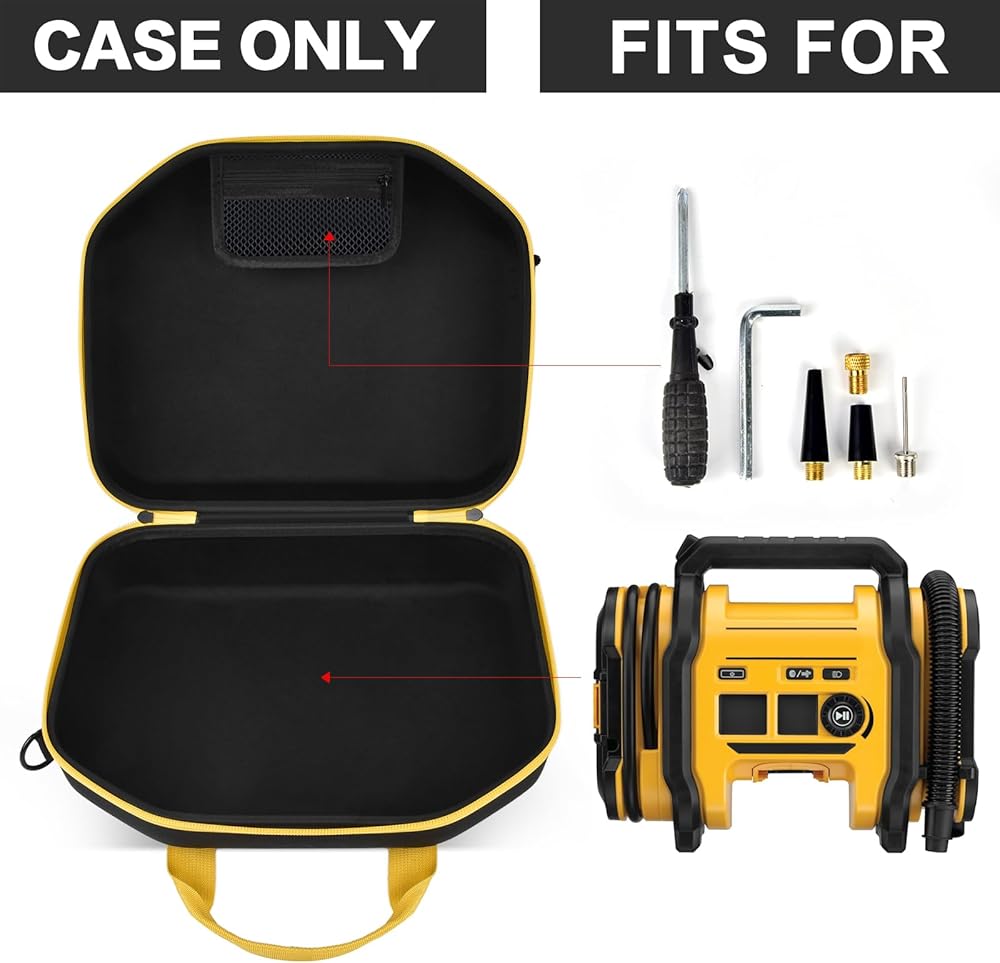 حالة التخزين لـ DeWalt Tyre Velatorator : تصميم حقيبة الأدوات لـ Dewalt 20V Max Tyre Velorator Cordless Air Compressor DCC020IB ، علبة مضخة بطارية الطاقة المحمولة مع إدراج إدراج إبرة نفخ ، 12 فولت DC PowerCord ، محول صمام Presta ، فوهة عالية الضغط ، حافظ على جميع مجموعة منظمة. الحجم الخارجي: A X B X C Inces (CASE فقط)