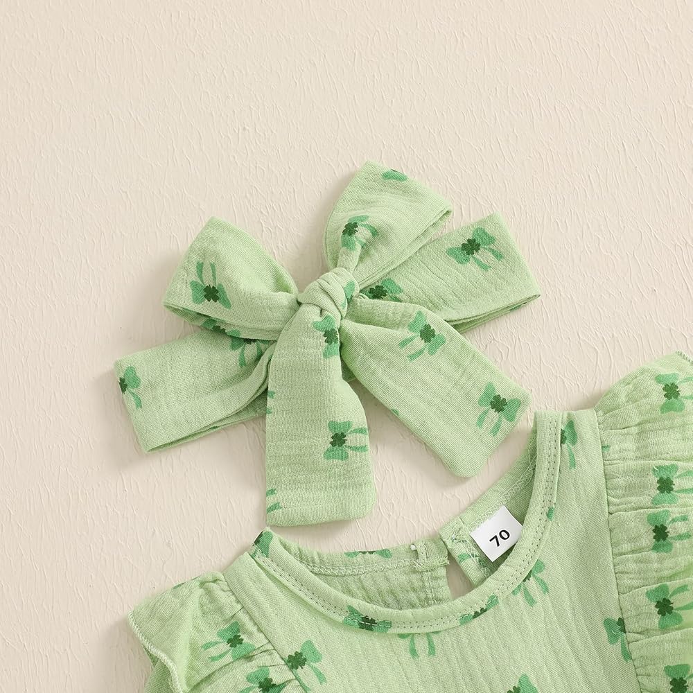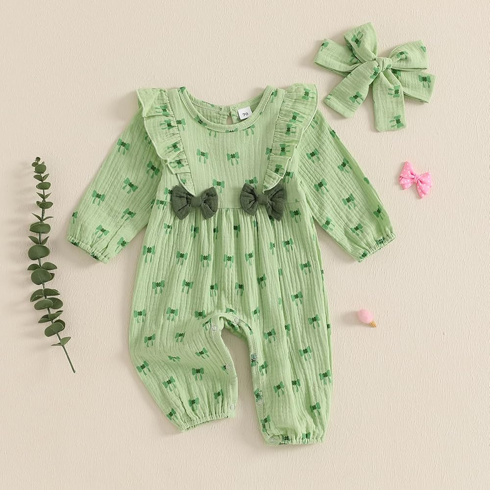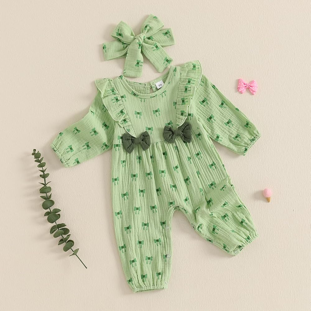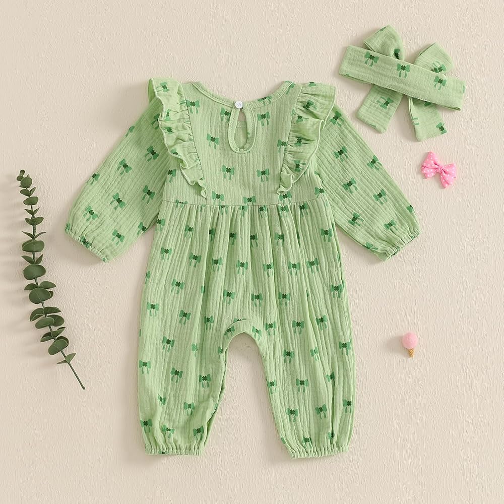 Baby Girl Spring Clothes Shamrock Bow Print Long Sleeve Crew Neck Ruffled Romper with Headband