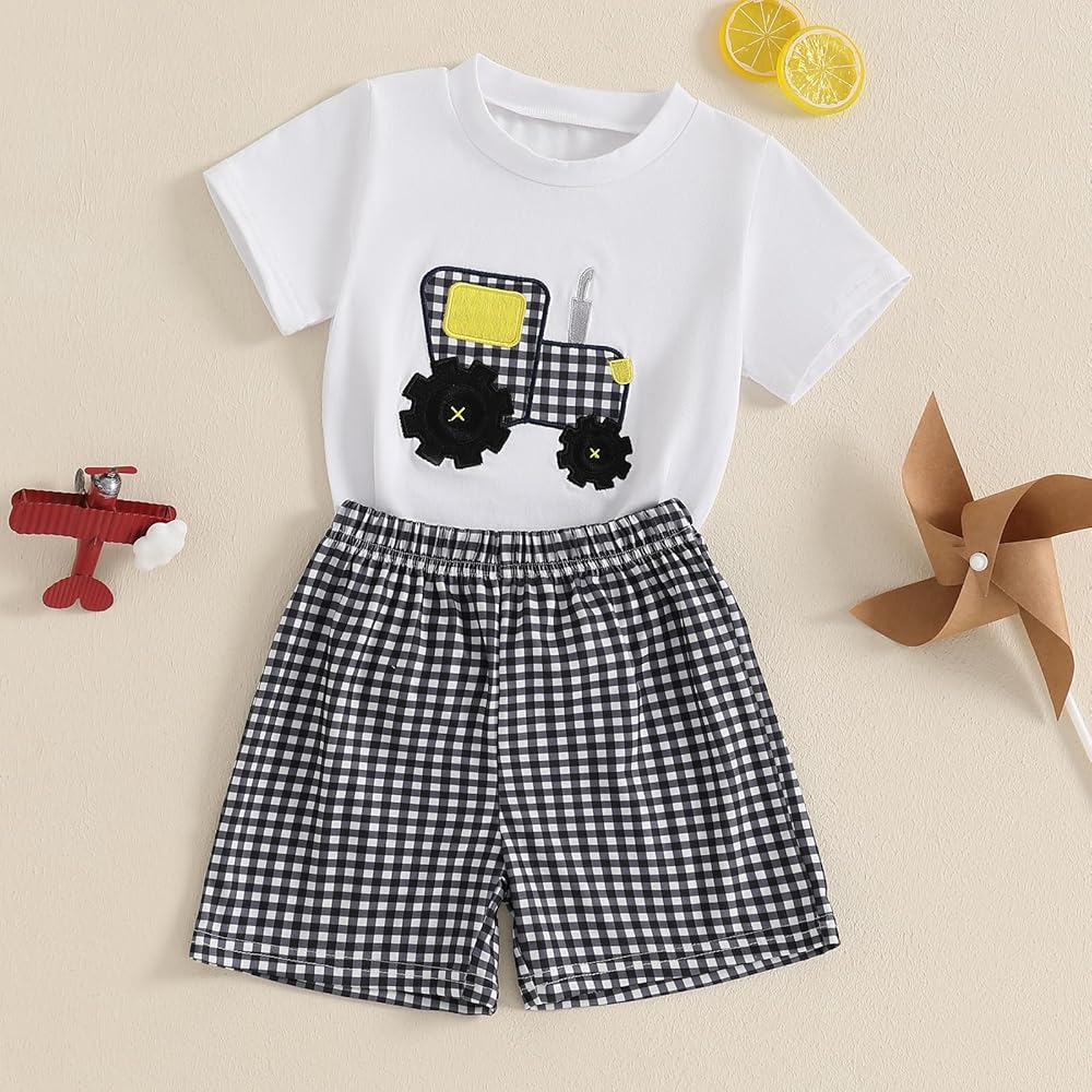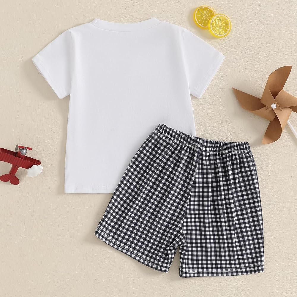 Baby Toddler Boy Golf Outfit Cart Embroidery Short Sleeve T-shirt Plaid Shorts with Pockets 2 Pcs Set