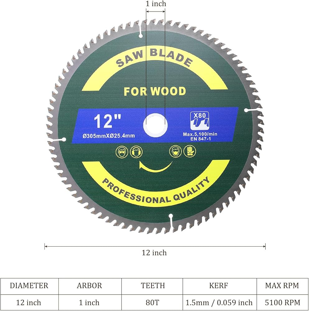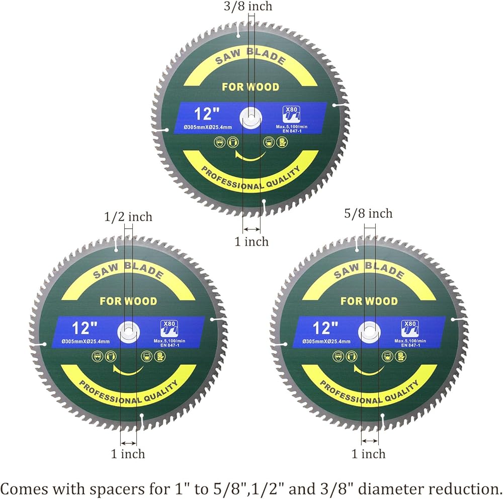 Arbor diameter: 1 inch (with washer adapters for 5/8 inch, 1/2 inch and 3/8 inch arbor reduction)