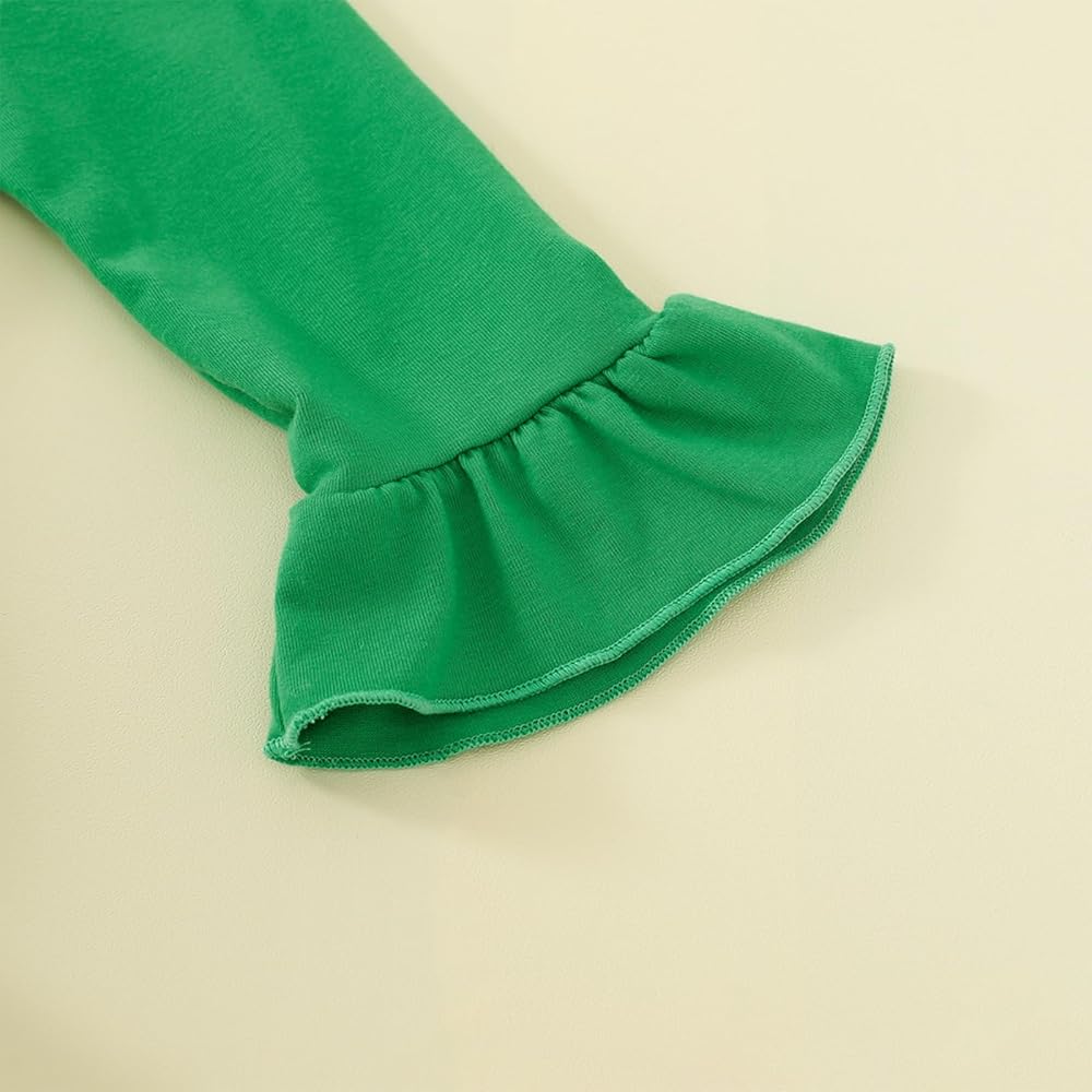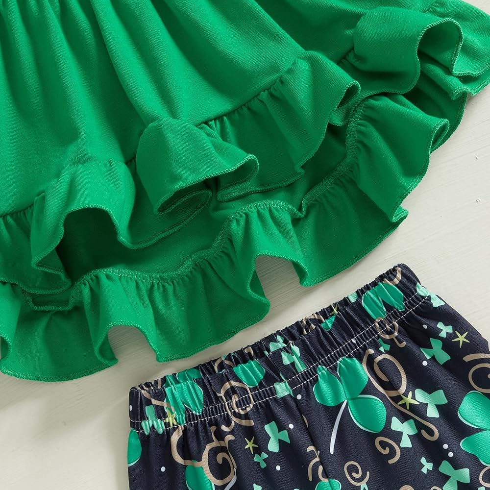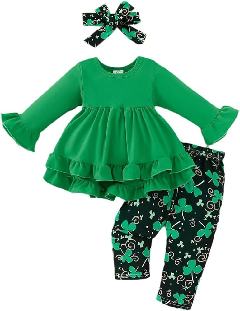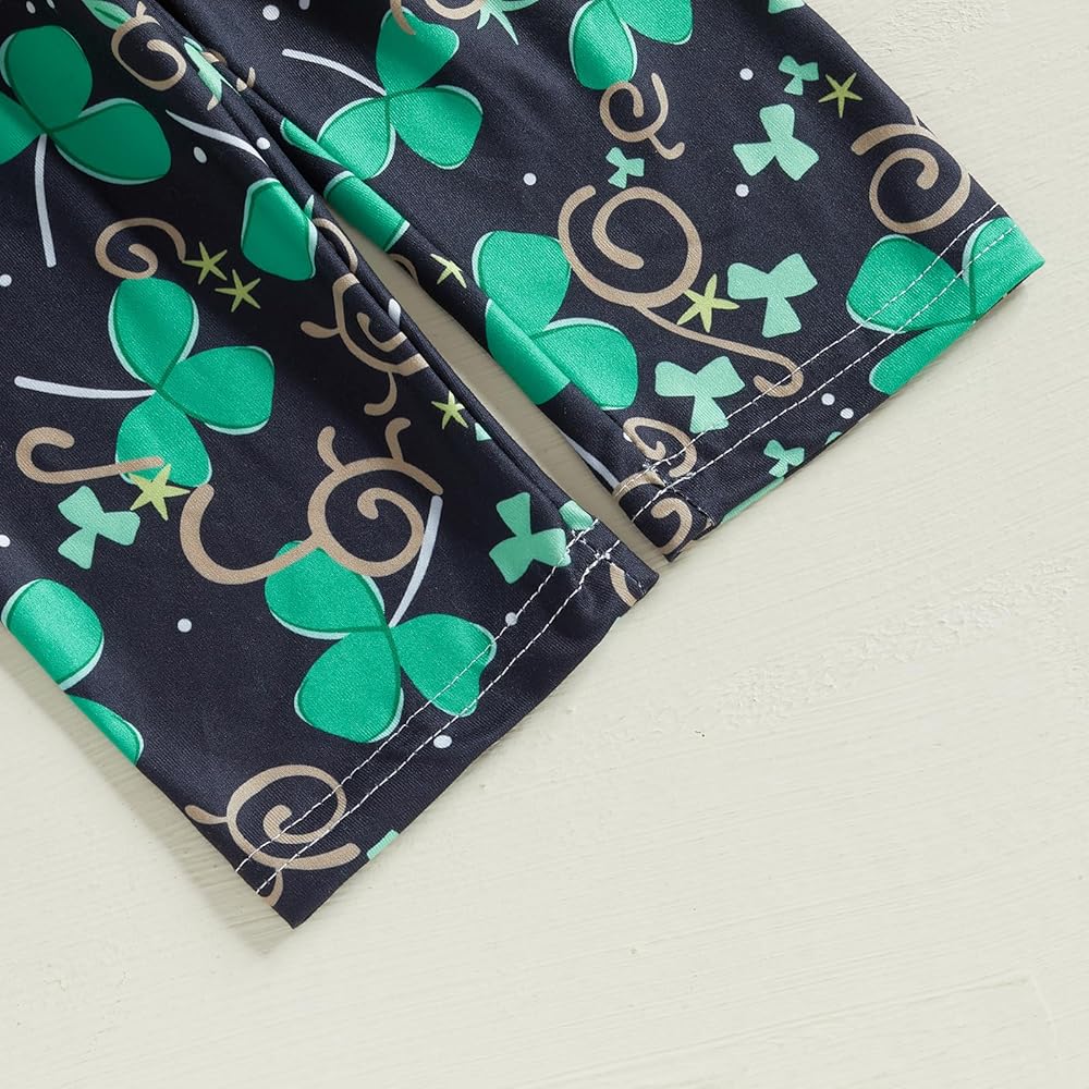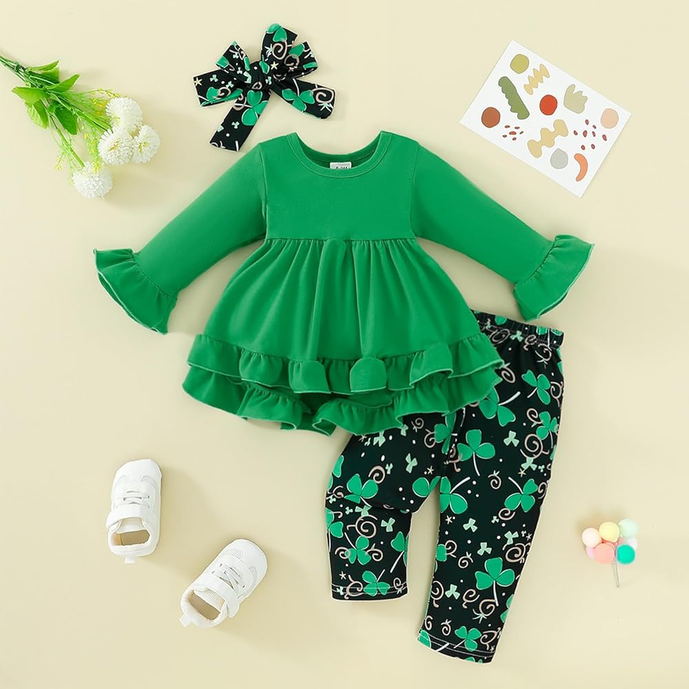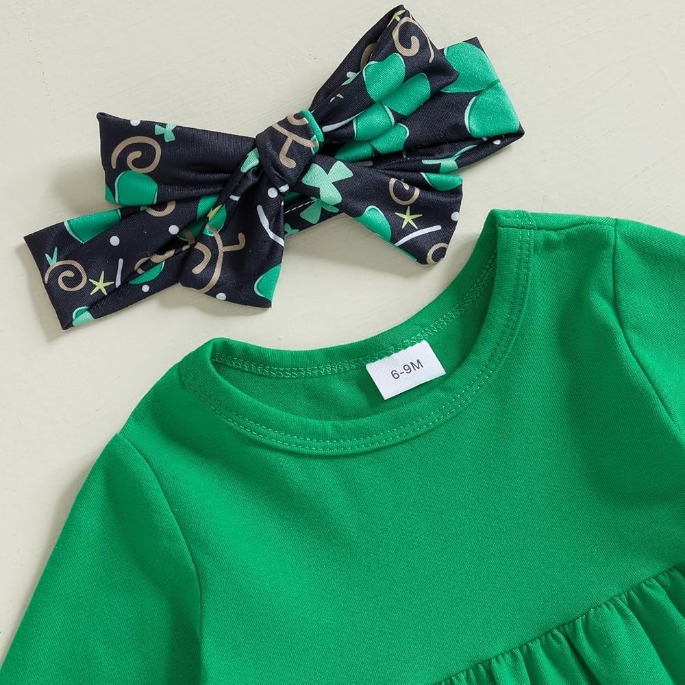 Toddler Girls Irish Day Sets Long Sleeve O Neck A-line Tops Clover Print Pants Headband Set
