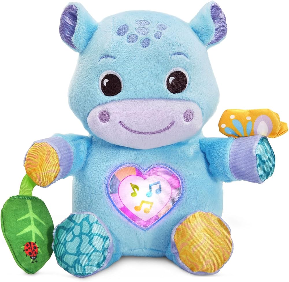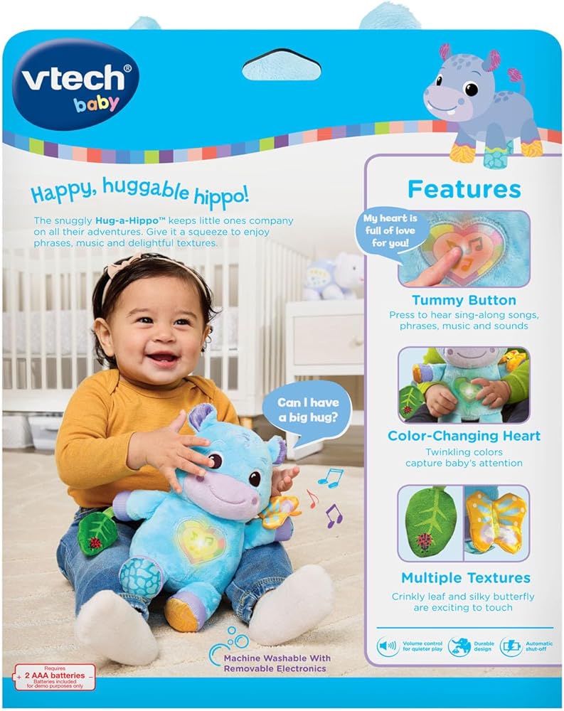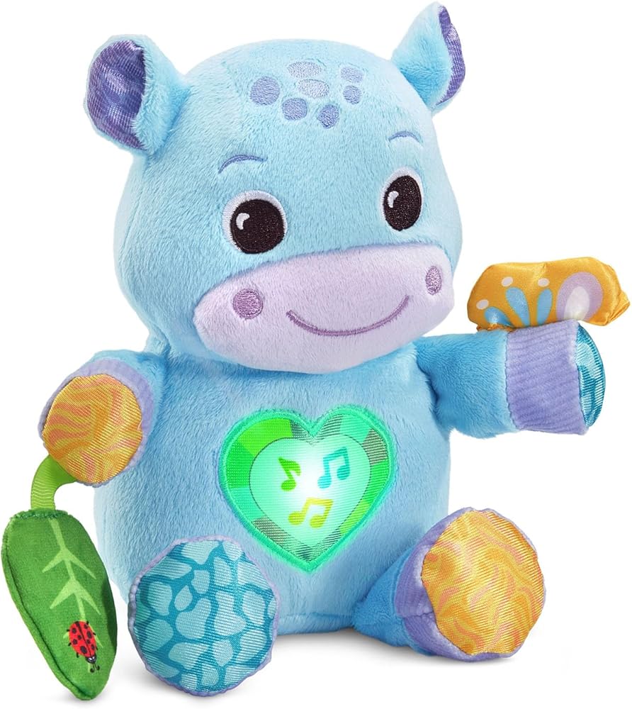 Huge on hugs, this plush hippo is perfect for popping into diaper bags or carrying along to keep little ones company on their adventures. Squish the light-up heart tummy button to hear how happy the hippo is to see you, plus enjoy sing-along songs, music and sounds. The twinkling colors will capture babies' attention and encourage more cuddles. Multiple textures, including a crinkly leaf, bumpy corduroy and silky butterfly are exciting to touch and the hippo can't wait to show it all off. Intended for ages 3+ months. Requires 2 AAA batteries. Batteries included for demo purposes only. New batteries recommended for regular use.