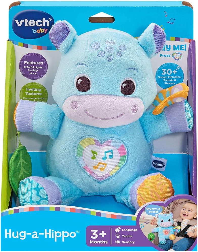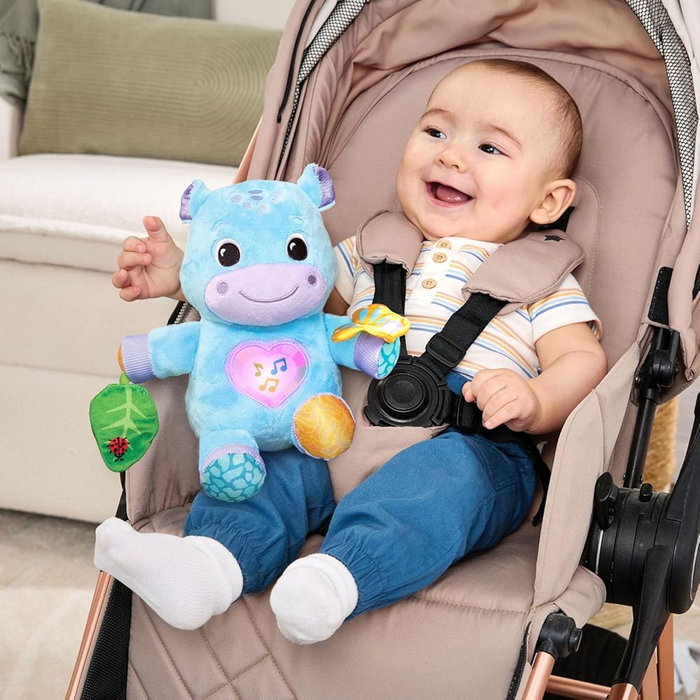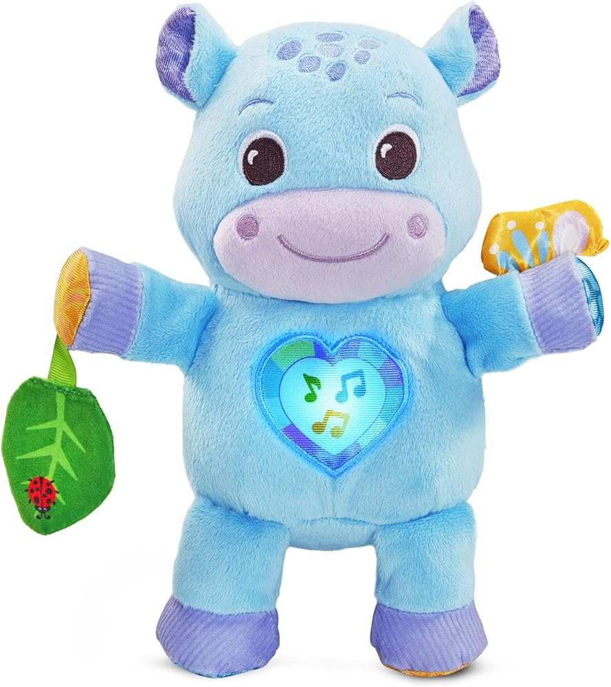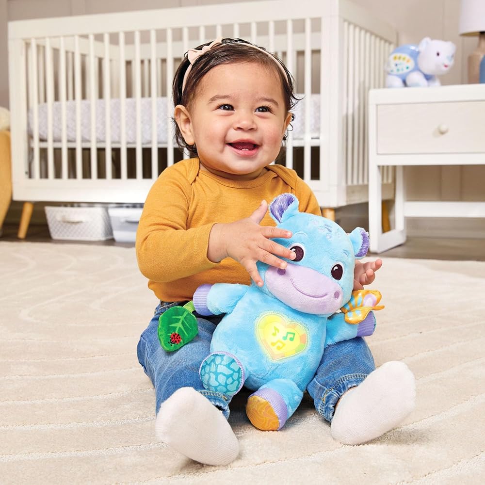 Huge on hugs, this plush hippo is perfect for popping into diaper bags or carrying along to keep little ones company on their adventures. Squish the light-up heart tummy button to hear how happy the hippo is to see you, plus enjoy sing-along songs, music and sounds. The twinkling colors will capture babies' attention and encourage more cuddles. Multiple textures, including a crinkly leaf, bumpy corduroy and silky butterfly are exciting to touch and the hippo can't wait to show it all off. Intended for ages 3+ months. Requires 2 AAA batteries. Batteries included for demo purposes only. New batteries recommended for regular use.