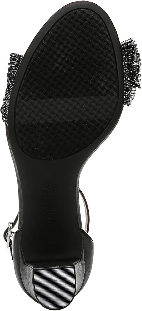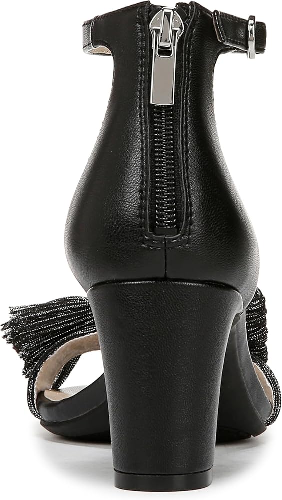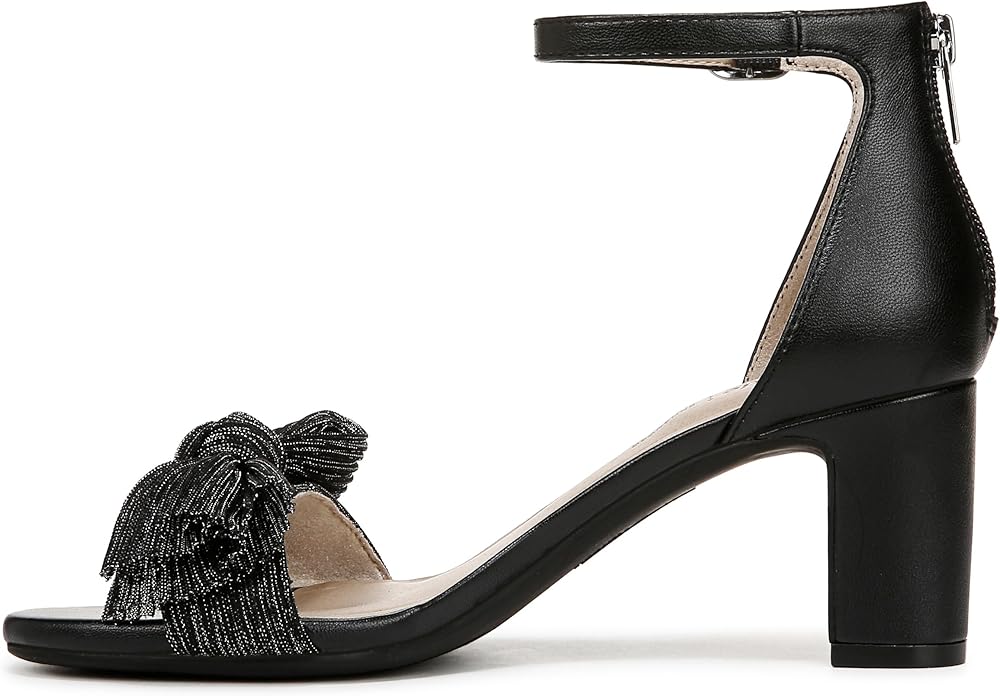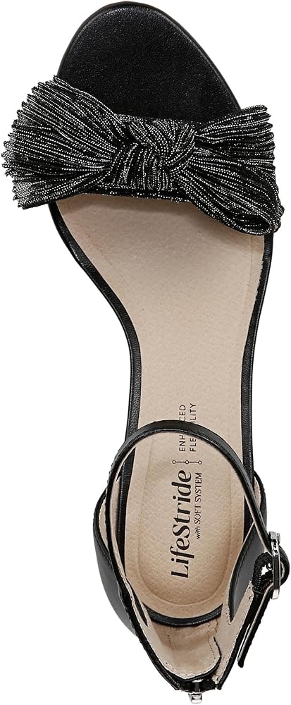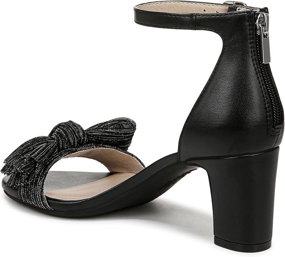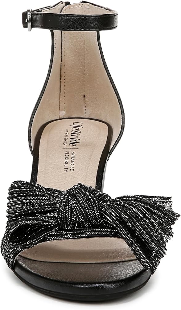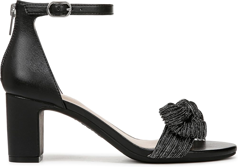 So chic, so flexible. These block heel sandals with a feminine bow detail look and feel effortless. Strappy sandals designed with faux leather, an open round toe, ankle strap with adjustable metallic buckle and built-in stretch, back zip for easy on/off, flexible platform, and feminine pleated bow detail. Linings crafted from partially recycled materials. Trusted Soft System® comfort technology for unmatched cushion, support, and flexibility in every pair. Enhanced flexibility with an ultra-flexible, padded platform heel for easy movement. Traction sole for extra stability. Just Right Height 2 1/2 inch block heel.