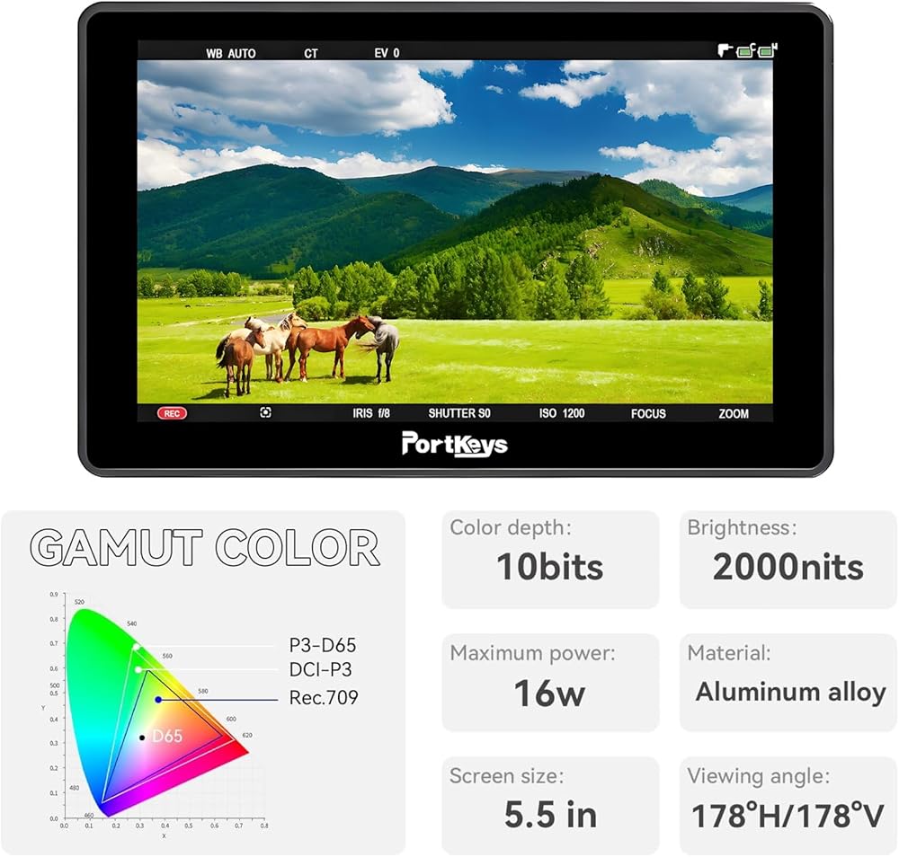 5.5" 2000nit 100% Rec.709 Wide Color Gamut: 5.5'' dynamic touch screen camera control monitor with 100% Rec.709 color standard, 1920*1080 Resolution, 2000 nit Brightness, BM5 IV WR displays reliable clarity, vivid color and sharp image details both in shadows and highlights