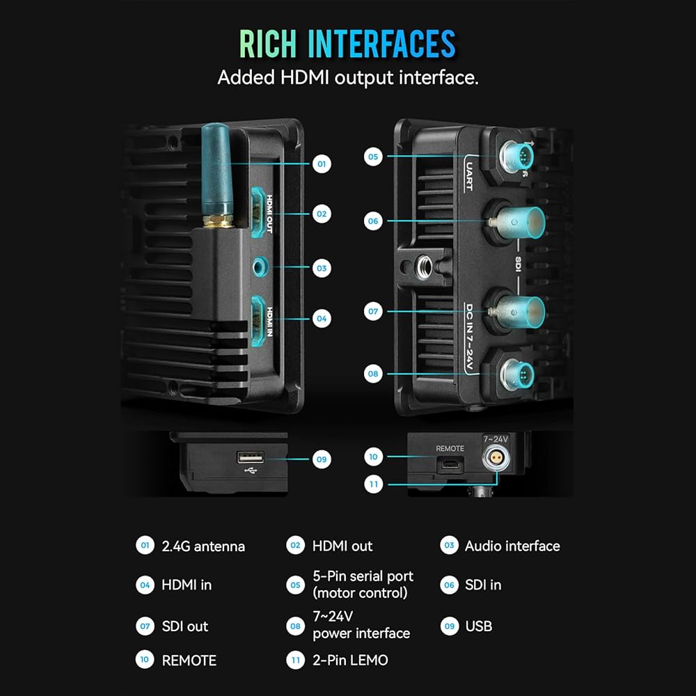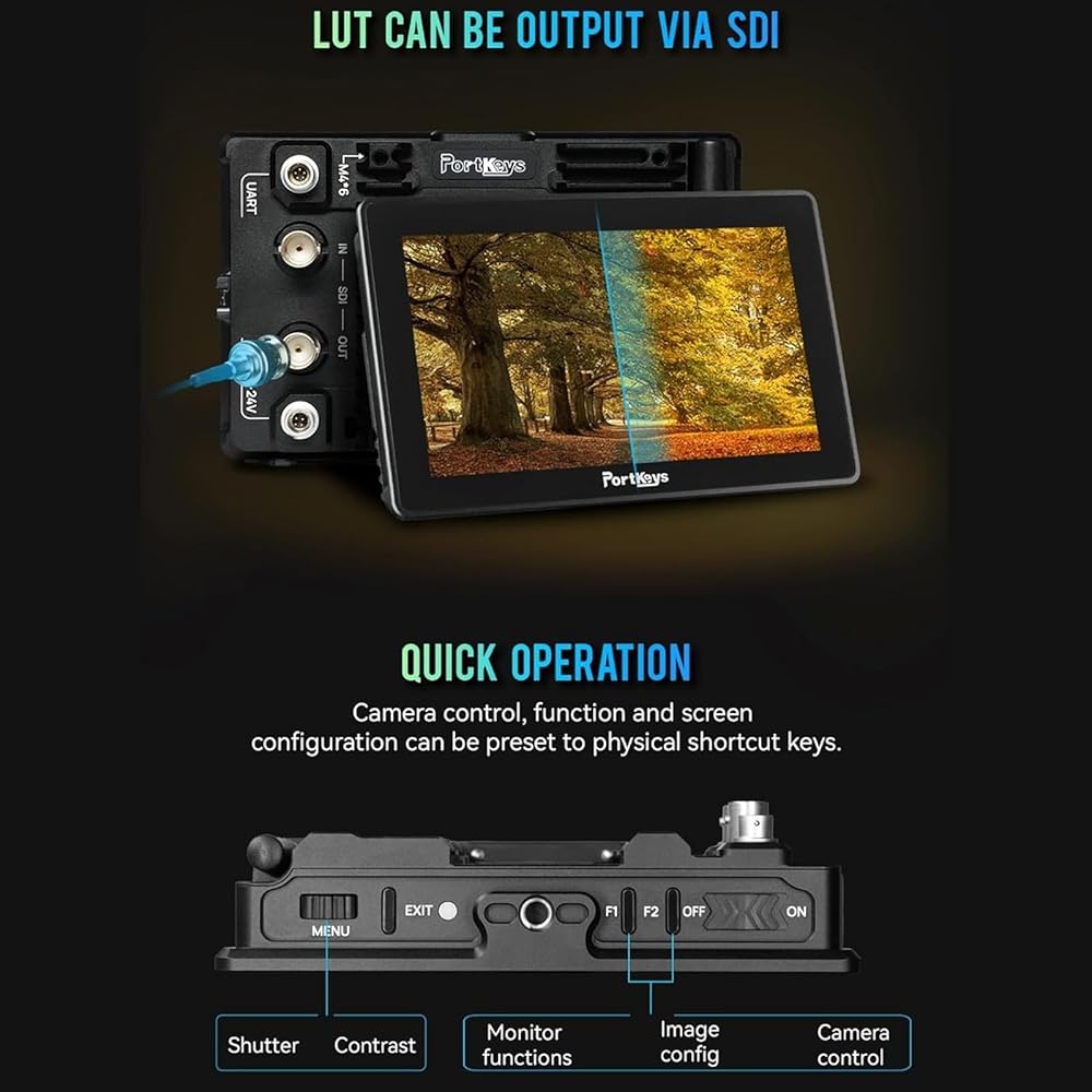 HDMI In/SDI Loop Out with LUT: There is an HDMI import and SDI input and output ports. SDI OUT can output an image applied with 3D LUT and new peaking, Custom JPG Picture Frozen Frame, after capturing an image, it can be overlay with real-time video by semi-transparent image (Must be a 16:9 1920*1080 jpg)