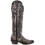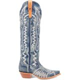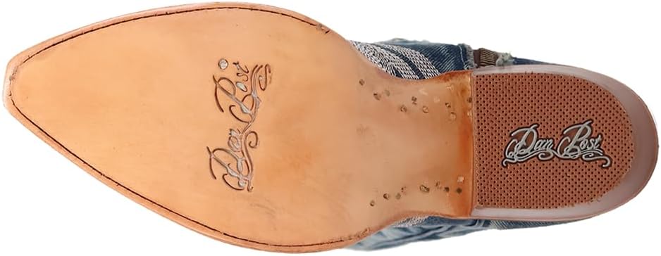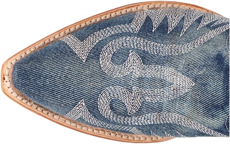 Sweet and Sassy in the Denim Darlin' boot from Dan Post. Featuring a leather outsole, popular fashion snip toe, with the vamp and shaft designed with elaborate contrast stitching, this 19-inch boot offers you a ultimate flex insole and low western heel for reliable comfort.