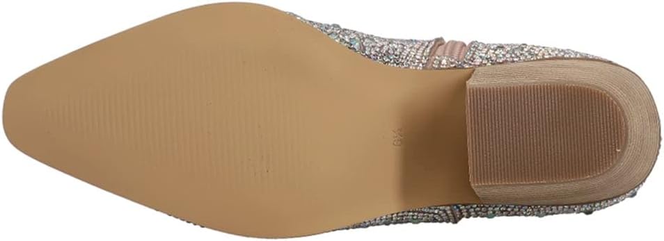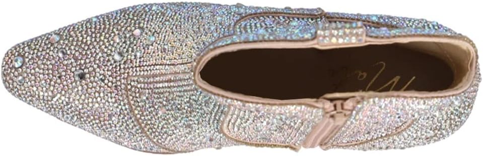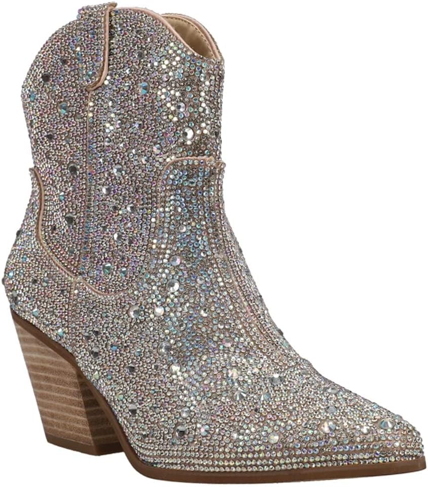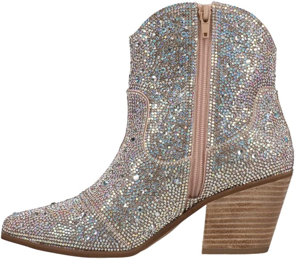 Step out in glam style with this block-heel bootie covered in sparkling crystals.