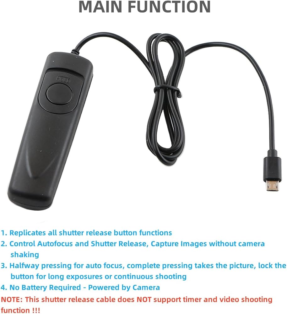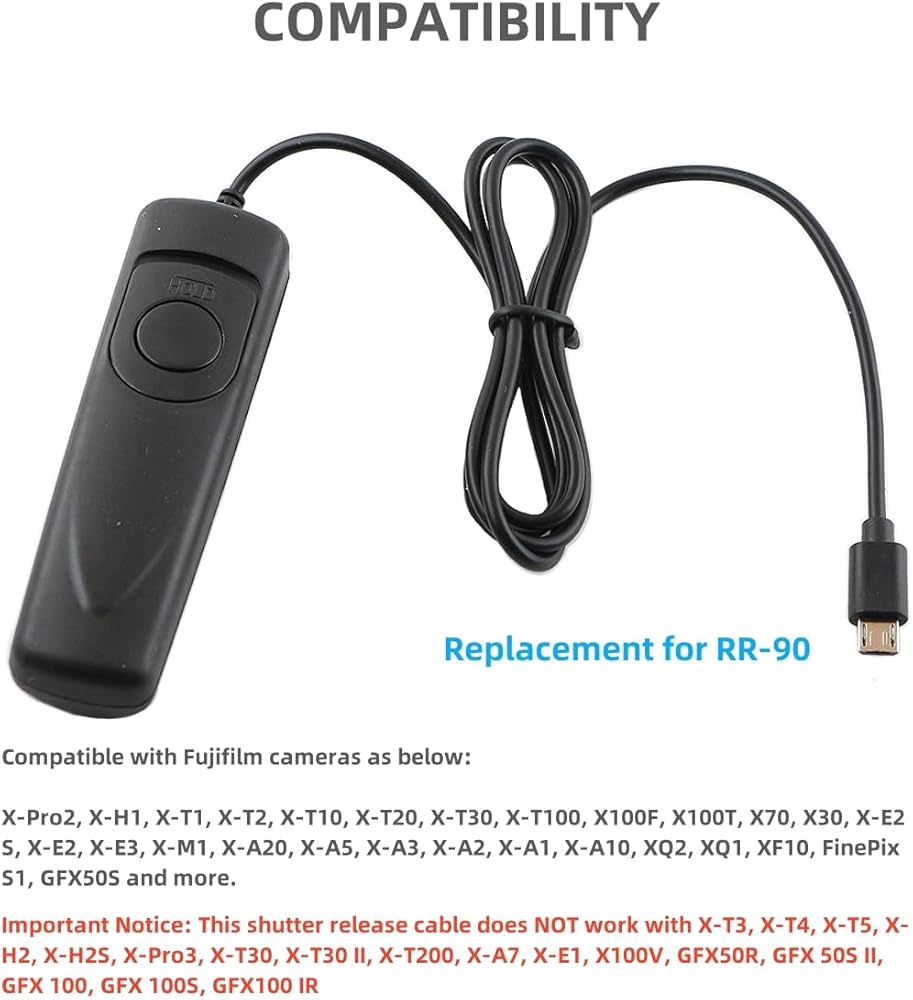 Important Notice: This shutter release cable does NOT work with X-T3, X-T4, X-T5, X-H2, X-H2S, X-Pro3, X-T30, X-T30 II, X-T200, X-A7, X-E1, X100V, GFX50R, GFX 50S II, GFX 100, GFX 100S, GFX100 IR