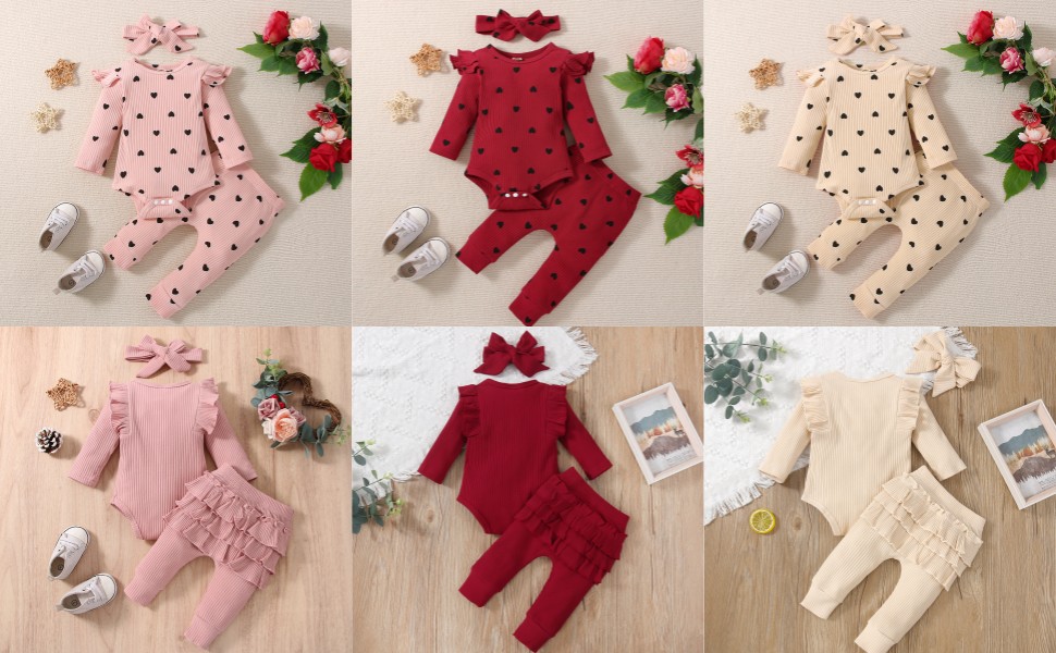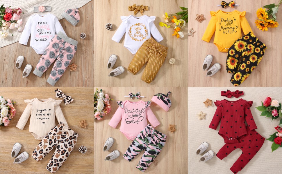 ميزة من ملابس طفلة الأطفال حديثي الولادة --- كتف مكشوف الطبقات ، وسروال ديزي مع الخصر المرن ، ومطابقة عقال Bowknot ، و 3 أجهزة كمبيوتر SPRING FRIPT WINTER COLLES FOR BAYS.