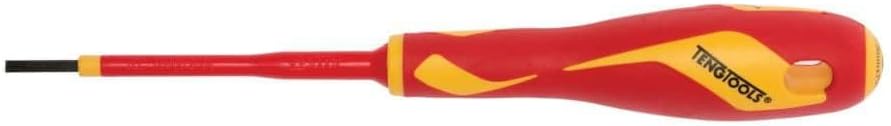 Insulated flat tip screwdriver with a two component handle and a black tip. Produced and tested according to the EN 60900 standard. Approved for live working up to 1000 volt AC)