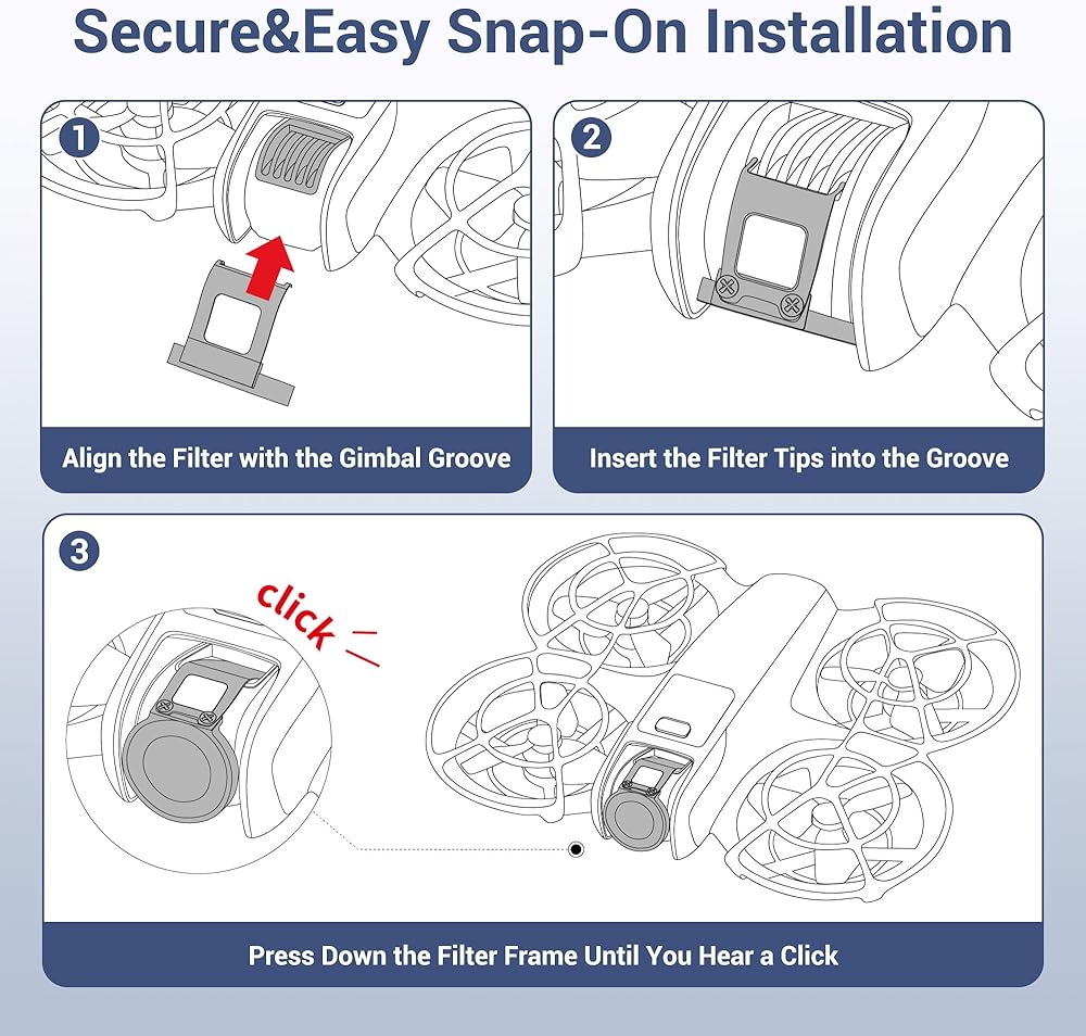 【التثبيت المسبق الآمن】: مع التصميم المفاجئ للحفاظ على المرشح في مكانه الراسخ أثناء الرحلة ، يمكن تثبيت مرشح الأشعة فوق البنفسجية على عدسة Neo Drone بسرعة وسهولة. التصميم النحيف يمنع التغذية ولن يؤثر على استخدامه واقي gimbal.