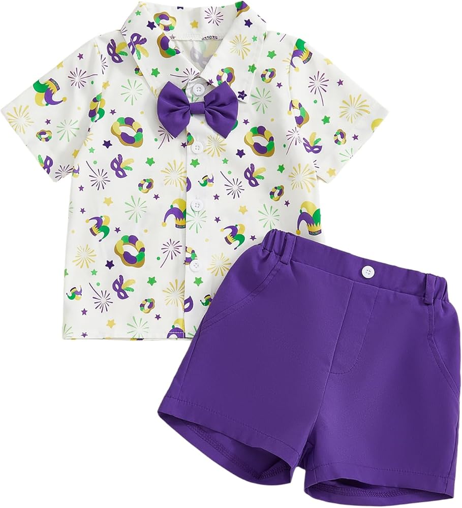 Design: Valentine toddler boys two piece outfit set, toddler valentines day shirt, valentines toddler boy short pants, including short sleeve, lapel neck, a bow tie, and button-up design tops with heart print, and solid color shorts with pockets, baby boy valentine shirt and shorts is versatile and energetic