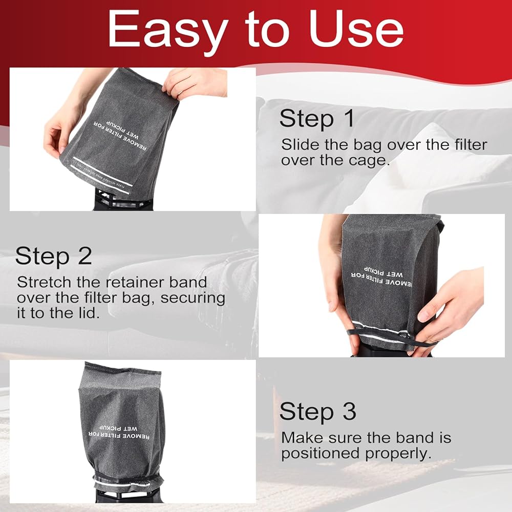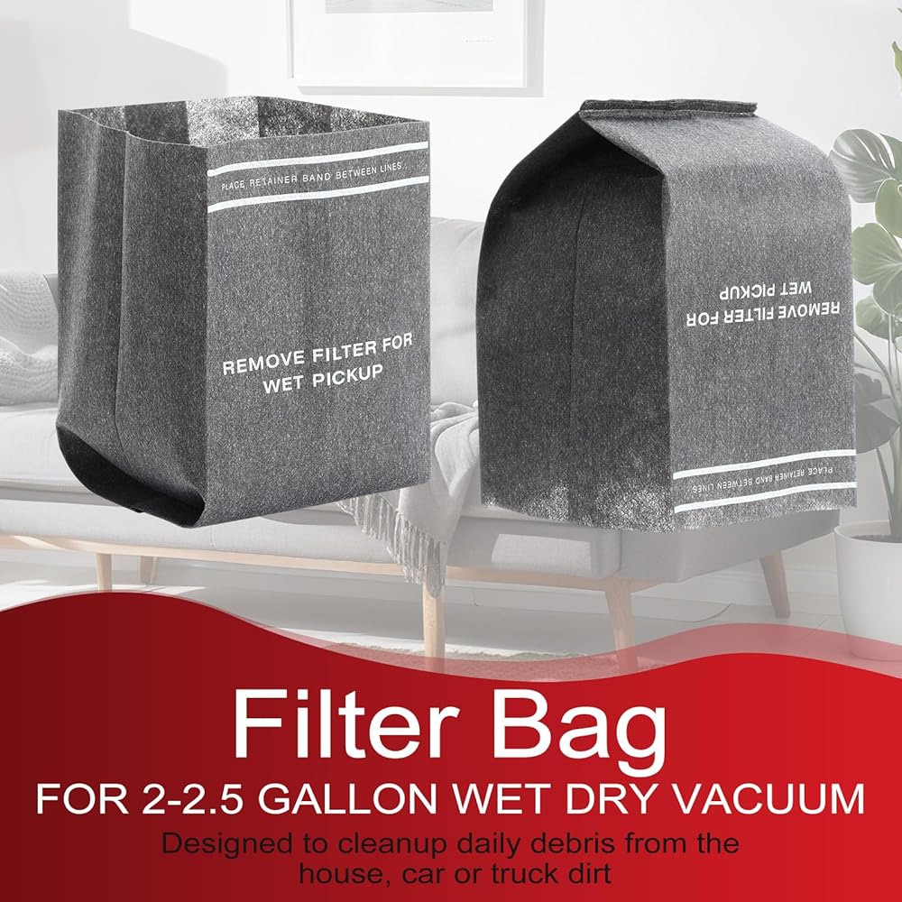 Easy to Install: it is easy to use the vacuum bags 2.5 gallon; Simply cover the vacuum cleaner's filter cage and fasten the filter bag with an elastic mounting band; Fast and easy to install, saving you time and effort