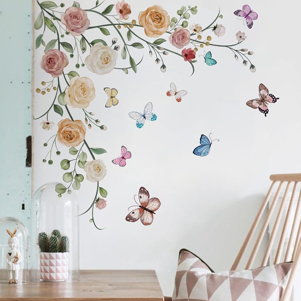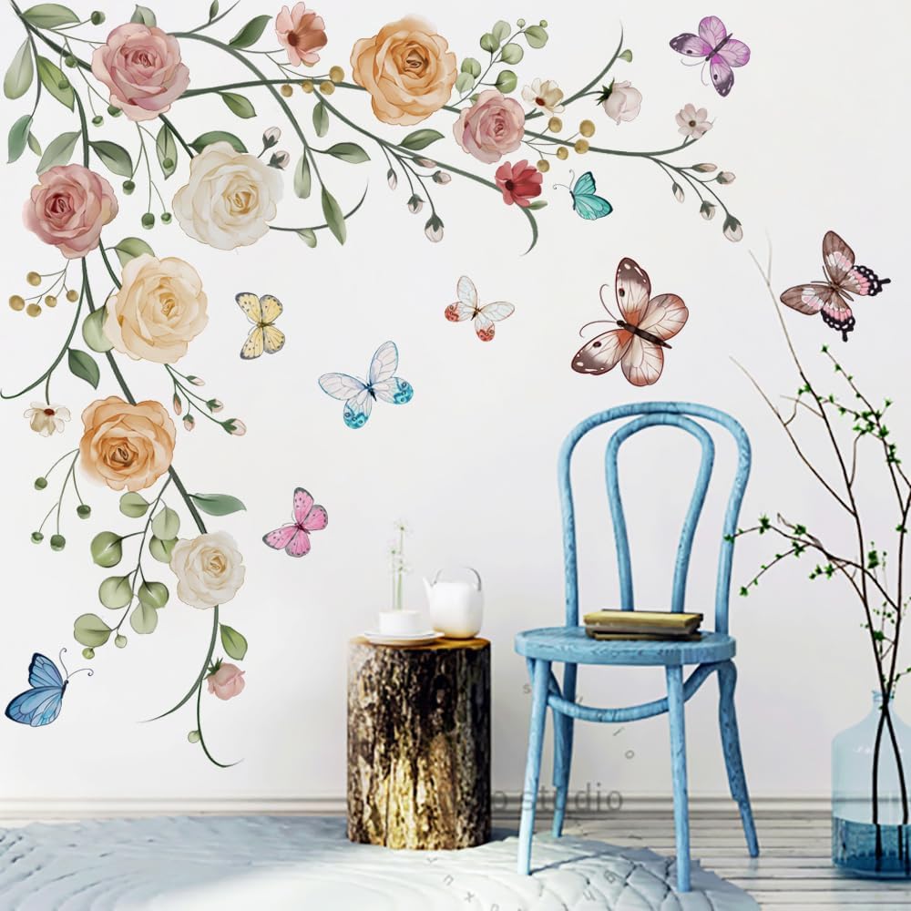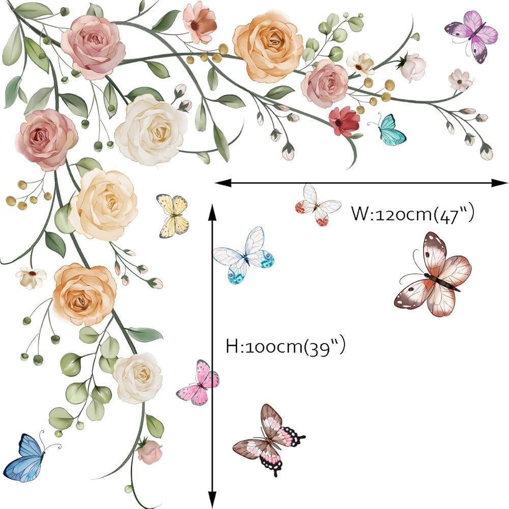 Runtoo شنقا زهرة كرمة جدار الفن ملصقات الفاوانيا الزهور الفراشة جدار الشارات للفتيات غرفة نوم غرفة المعيشة