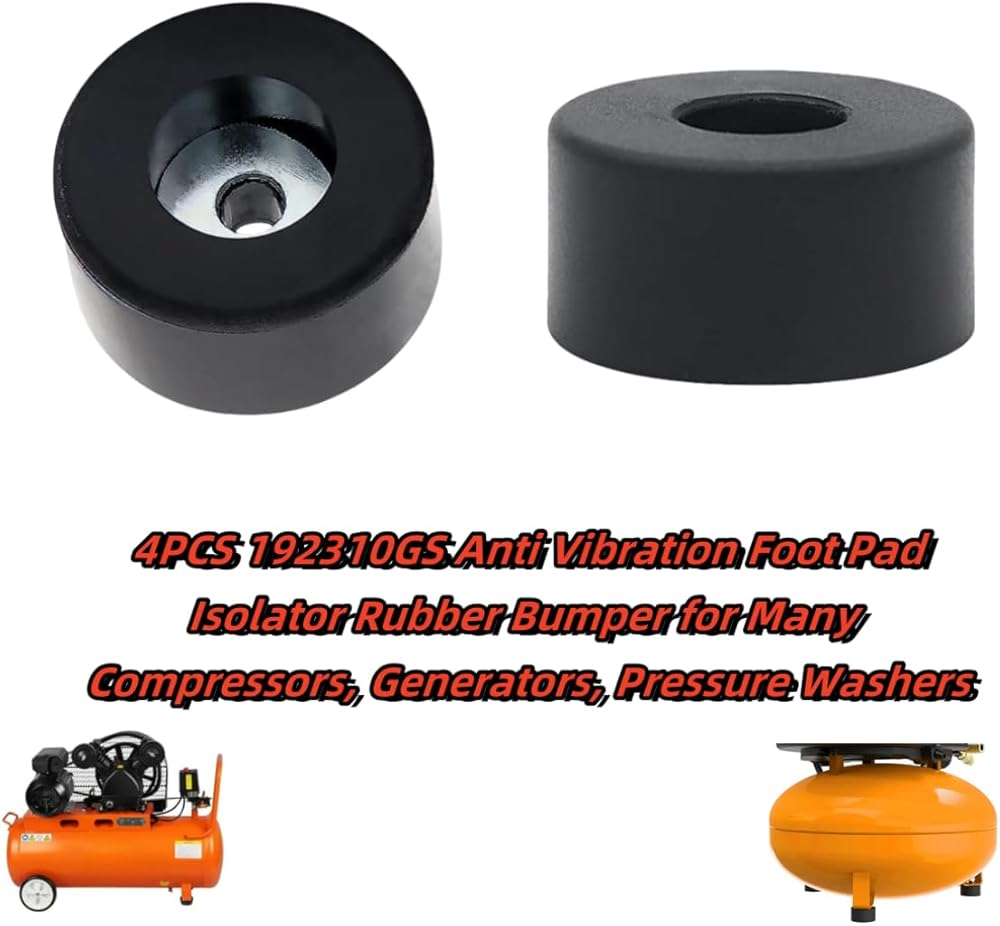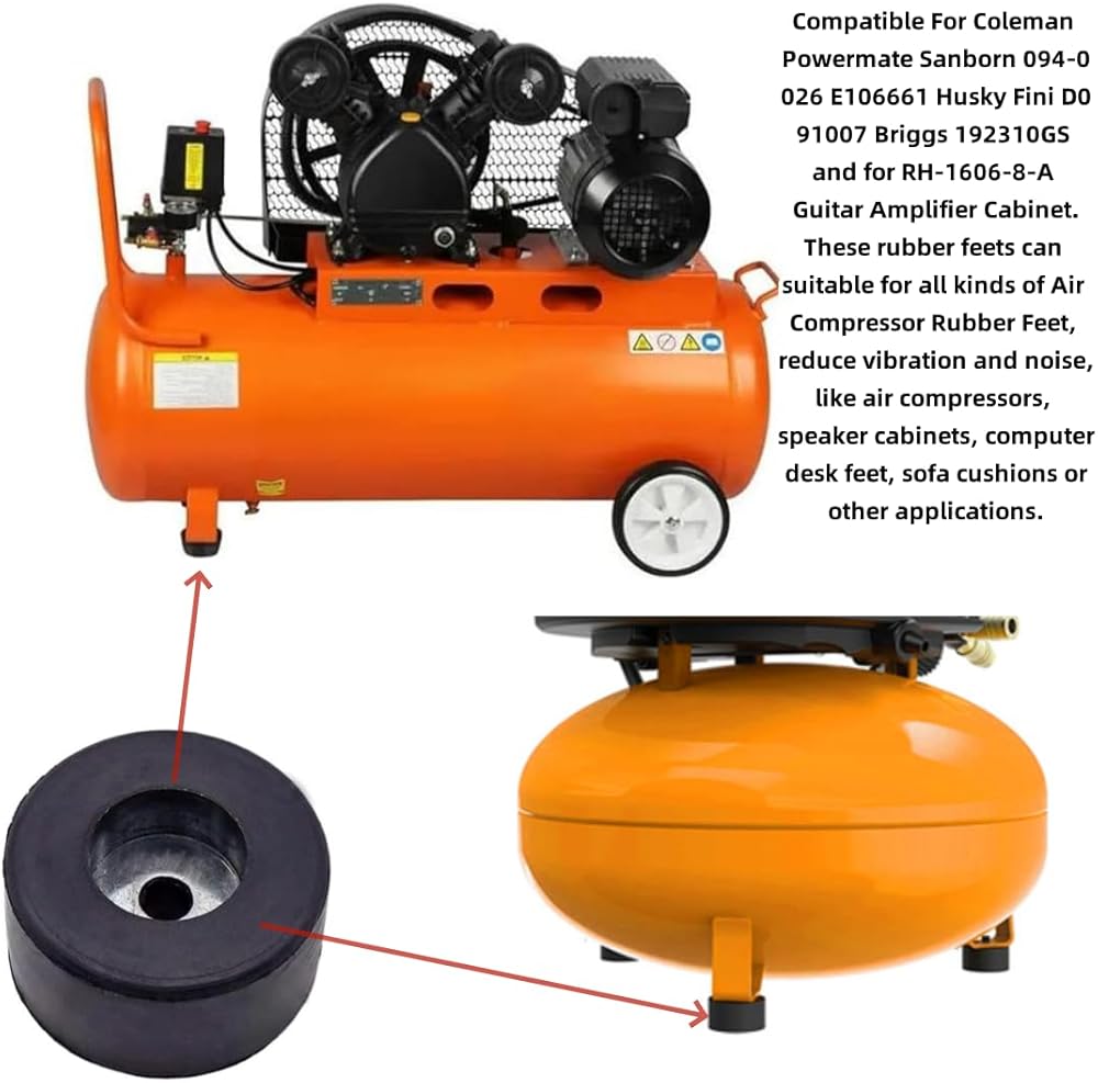 Fits Anti Vibration Foot Pad Isolator Rubber Bumper for Many Compressors, Generators, Sound Machine , Power Amplifie , Shockproof Rubber ,Instrument Rubber , Furniture Moisture-Proof Foot Pads Ect Size: The antivibration pad is 1-1/2" D, 3/4" H, 1/4" Inch Hole. Fit for:The rubber feet for the air compressor are suitable for use with Coleman Powermate Sanborn 094-0026 E106661, Husky Fini D091007, and Briggs & Stratton 192310GS models. Additionally, the replacement rubber feet are compatible with many compressors, generators, pressure washers anti vibration foot padMade of high quality rubber material,the anti vibration isolation pads is durable, anti-slip, anti-corrosion