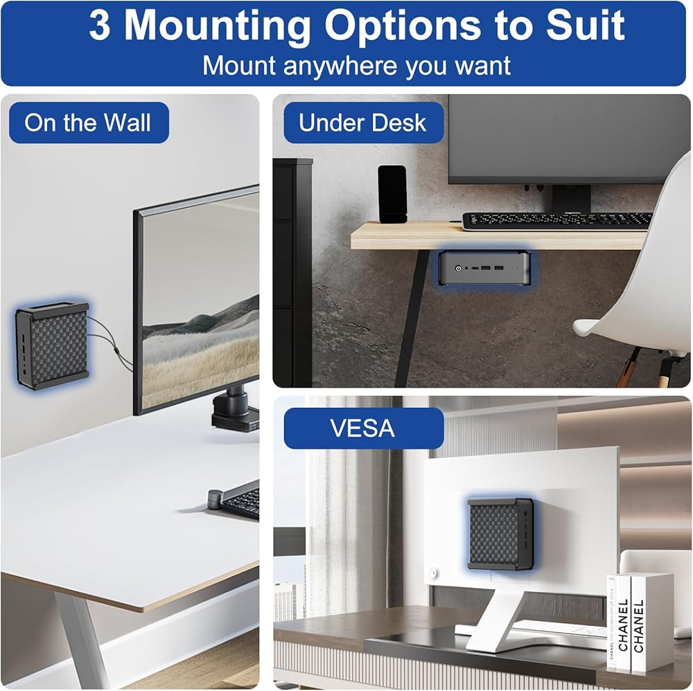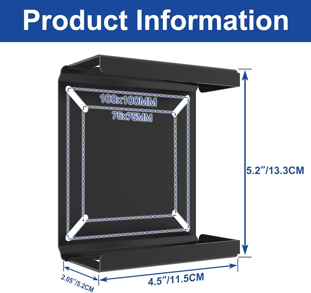 ثلاثة خيارات التثبيت - Mini Mount: Mini PC Vesa Mount for Beelink ، قم بإرفاق Peelink Mini PC بسهولة إلى الجزء الخلفي من شاشتك باستخدام نمط VESA 75 × 75 مم أو 100 × 100 مم. يمكنك تركيبه على الحائط أو أسفل المكتب لتلبية احتياجاتك المختلفة.