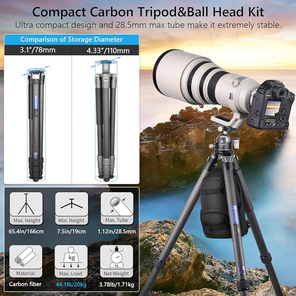 ترايبود كاميرا كاميرا مدمجة مع كرة محتامة 46 مم رأس ترايبود ترايبود 28.5 مم كحد أقصى أنبوب الساق مستقر خفيفة الوزن ألياف الكربون حامل مع رأس الكرة السويسري ARCA وحفلة الحجر كحد أقصى 44.1 رطل/20 كجم