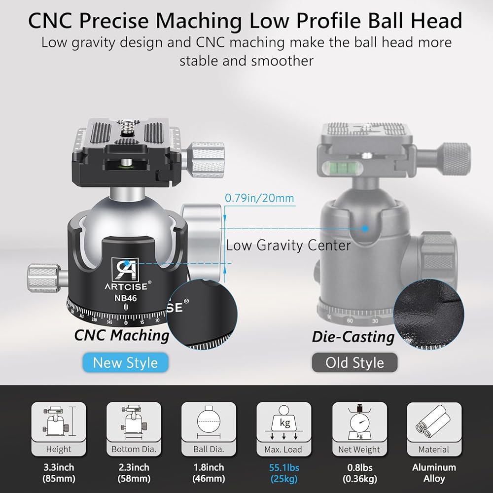 【46 مم رأس ترايبود ترايبود منخفض 46 مم】: التصميم المنخفض مع قطر الكرة الكبير 46 مم يقلل من مركز الثقل بنسبة 15 ٪ ، مما يمنحه استقرارًا أفضل. المعالجة الفائقة من CNC ، والمعالجة السطحية المختصرة ، مع شعور ناعم للغاية ومتانة ممتازة. يبلغ الوزن 0.36 كجم فقط /0.8 رطل ، لكنه يوفر سعة حمولة تبلغ 55.1 رطل /25 كجم (رأس الكرة يأتي مع لوحة إطلاق سريعة من ARCA سويسرية)