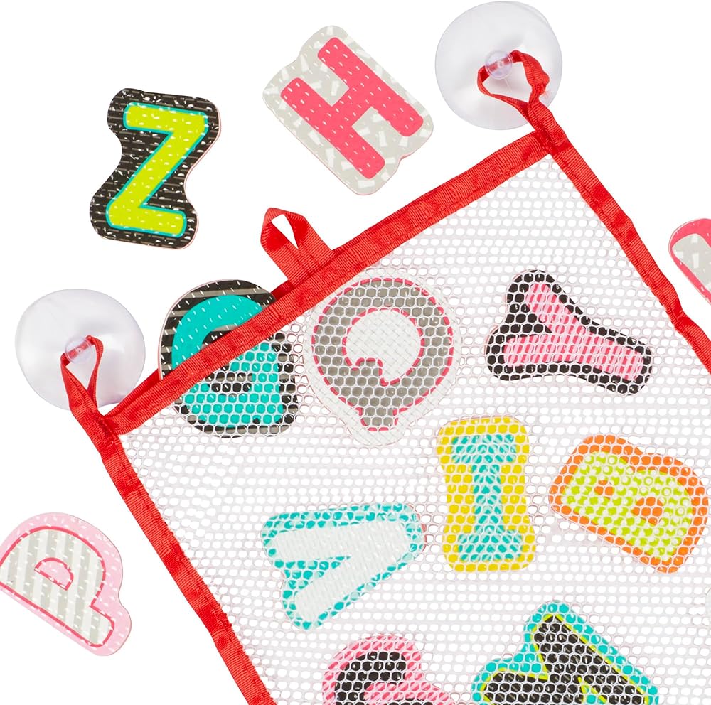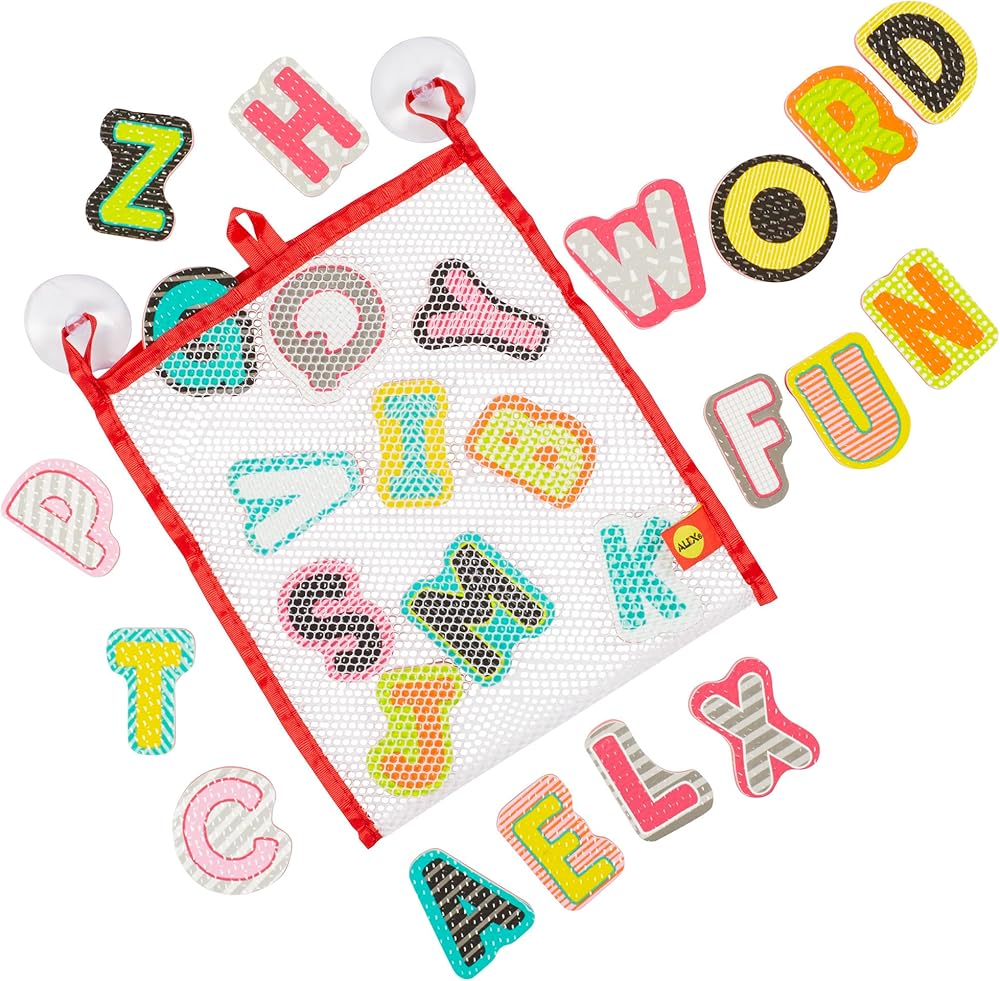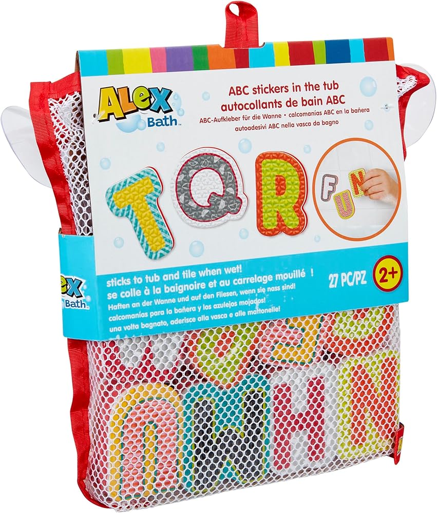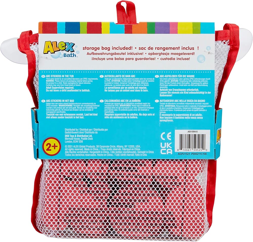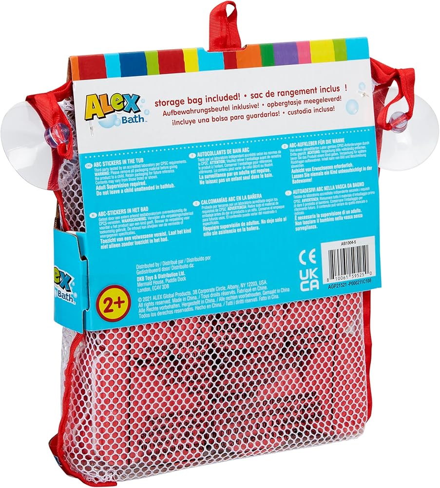 ABC STICKERS IN THE TUB - Using colorful foam bath stickers that cling to the bathtub walls when wet, kids can brush up on their ABC's or spelling while soaking in the bathtub. With all 26 letters included, children can practice their ABCs or spell out new words while they soak and splash. Featuring all 26 letters of the alphabet, children can immerse themselves in learning as they arrange the stickers to form words and explore language in a playful, water-filled environment. After the fun, the stickers and mesh storage bag make cleanup a breeze. Simply hang the bag with its suction cups to drip dry until the next aquatic learning session. Designed for children aged 2 years and older, this set sparks creativity and enhances early literacy skills in a delightful, water-filled environment. Make bath time both fun and educational with ALEX Bath ABC Stickers in the Tub!