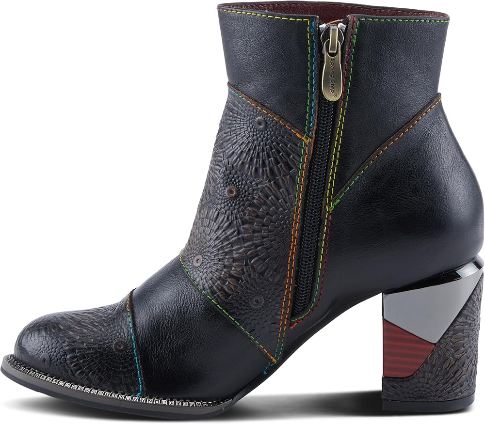 TOPANGA ignites the imagination with its dynamic flair! Elevate your style with these eye-catching booties that effortlessly blend artistry and sophistication. Striking leather bootie adorned with an embossed firework reminiscent design on the upper for a captivating look. The firework motif elegantly extends to the heel, creating a seamless and eye-catching design element. Cool typewriter design along the welt adds a touch of vintage-inspired charm and uniqueness. Convenient inside zipper closure allows for easy on and off, ensuring a hassle-free experience. Disclaimer: L'Artiste products are made with natural tanned leather using traditional hand painting techniques. This unique finishing process is used to create a natural effect with color variations to deliver authentic look and beauty.