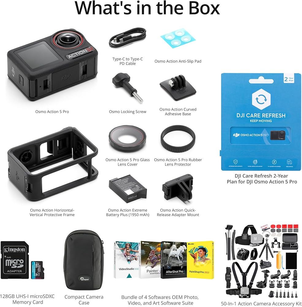 Bundle Includes: DJI Osmo Action 5 Pro Adventure Combo Camera with 4n DJI Care Refresh 2-Year Plan (Physical Card), 50-In-1 Action Cam Accessory Kit, 128GB MicroSDXC Memory Card, Camera Case, and Photo Software Bundle of 4