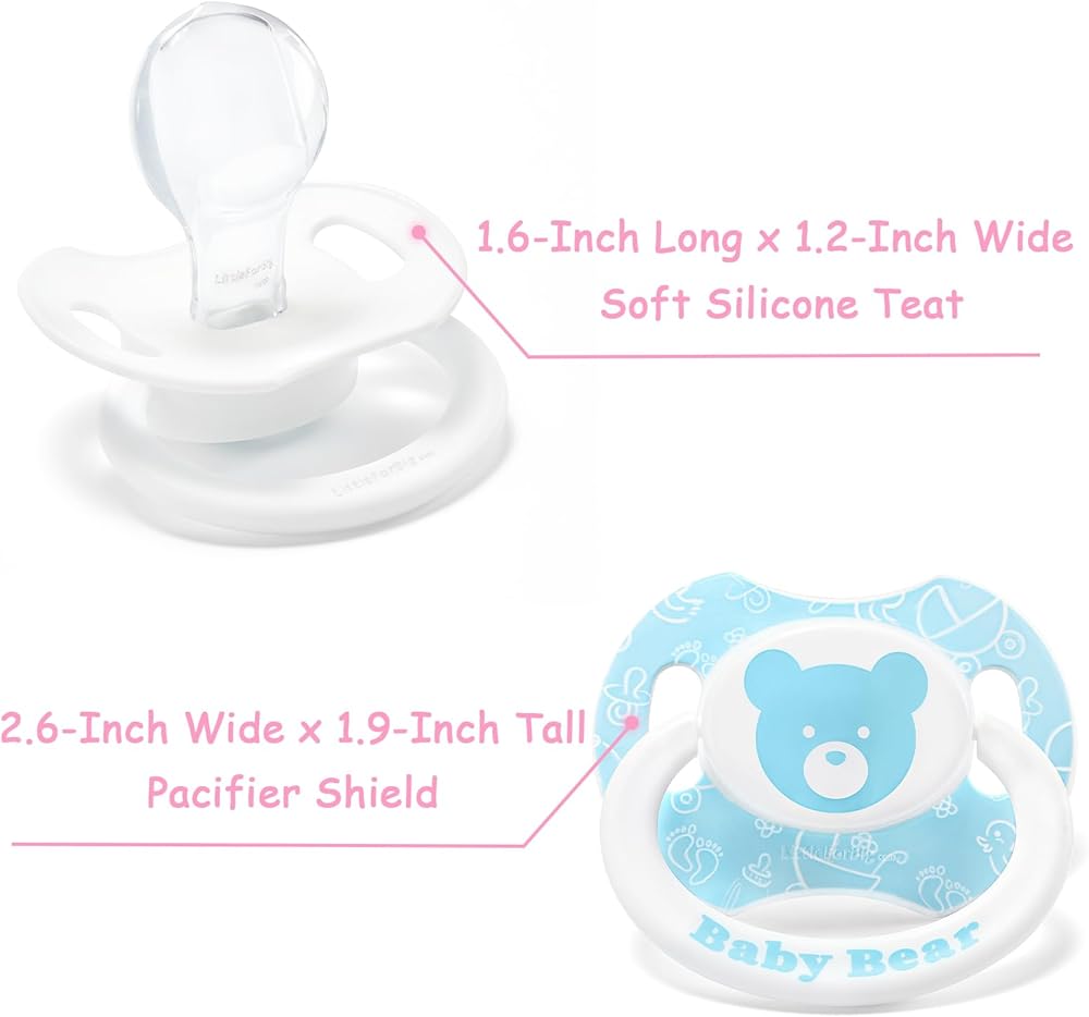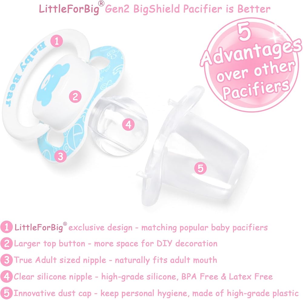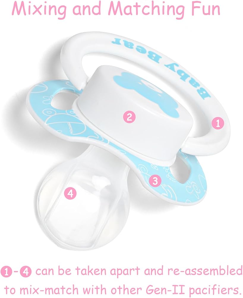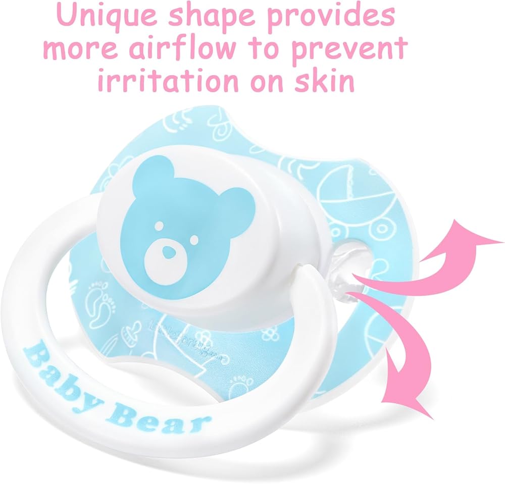 • Pacifier المطبوعة رائعتين: جرب سحر باسيات الدب المنقوشة ، المصممة خصيصًا لعشاق مصاصة البالغين. يضم طباعة دب أزرق مبهج ومحبوب على الزر ، و "دب" مطبوع على الدرع ، مضمون لجلب الفرح والراحة.