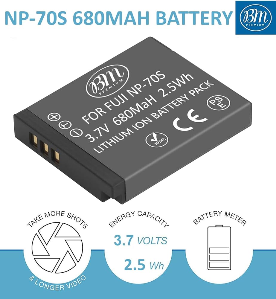 Bring your digital camera back to life with a new battery. Make sure you never miss another once-in-a-lifetime moment by having a new NP-70S battery specifically designed for your Fujifilm Finepix digital camera. BM Premium rechargeable batteries are engineered to meet or exceed OEM specifications and feature the latest battery technology, including advanced circuitry, voltage regulation, and thermal circuit protection. BM Premium batteries include a one-year warranty.